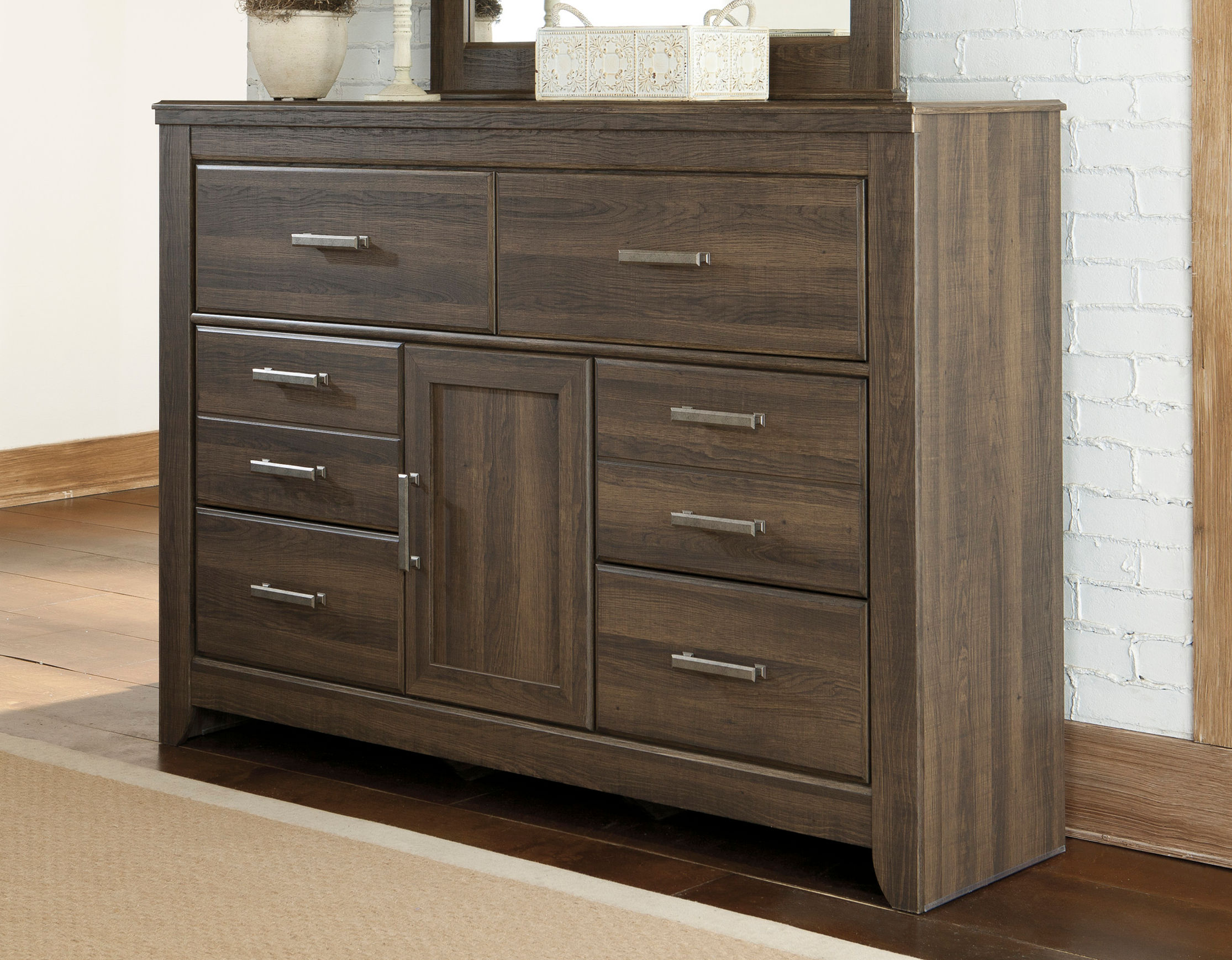 Get the look of posh barn wood without setting foot in a salvage yard. Replicated rough-sawn oak of the Juararo dresser has a vintage finish that is reminiscent of a timeworn family heirloom. Warm, rustic and naturally beautiful, it’s just got that ageless appeal. Sleek, mod pulls in a pewter tone are a snappy finishing touch.