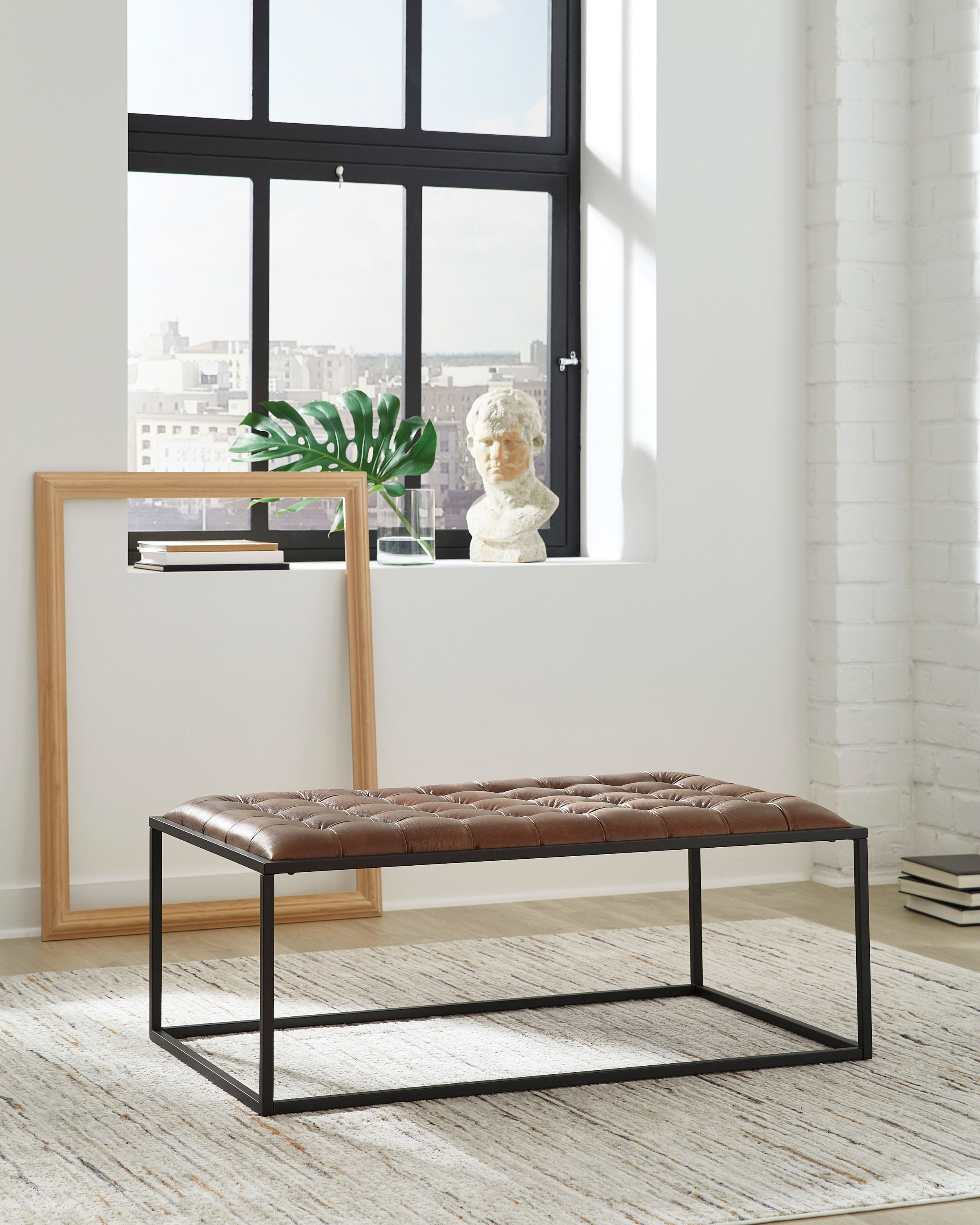 Master the art of casual chic with this coffee table ottoman. The soft, inviting top, upholstered in supple brown leather, is perfectly balanced by a clean-lined black metal base. Its expansive surface provides ample room for trays and books, making it a highly functional and oh-so-cool anchor for your seating area.