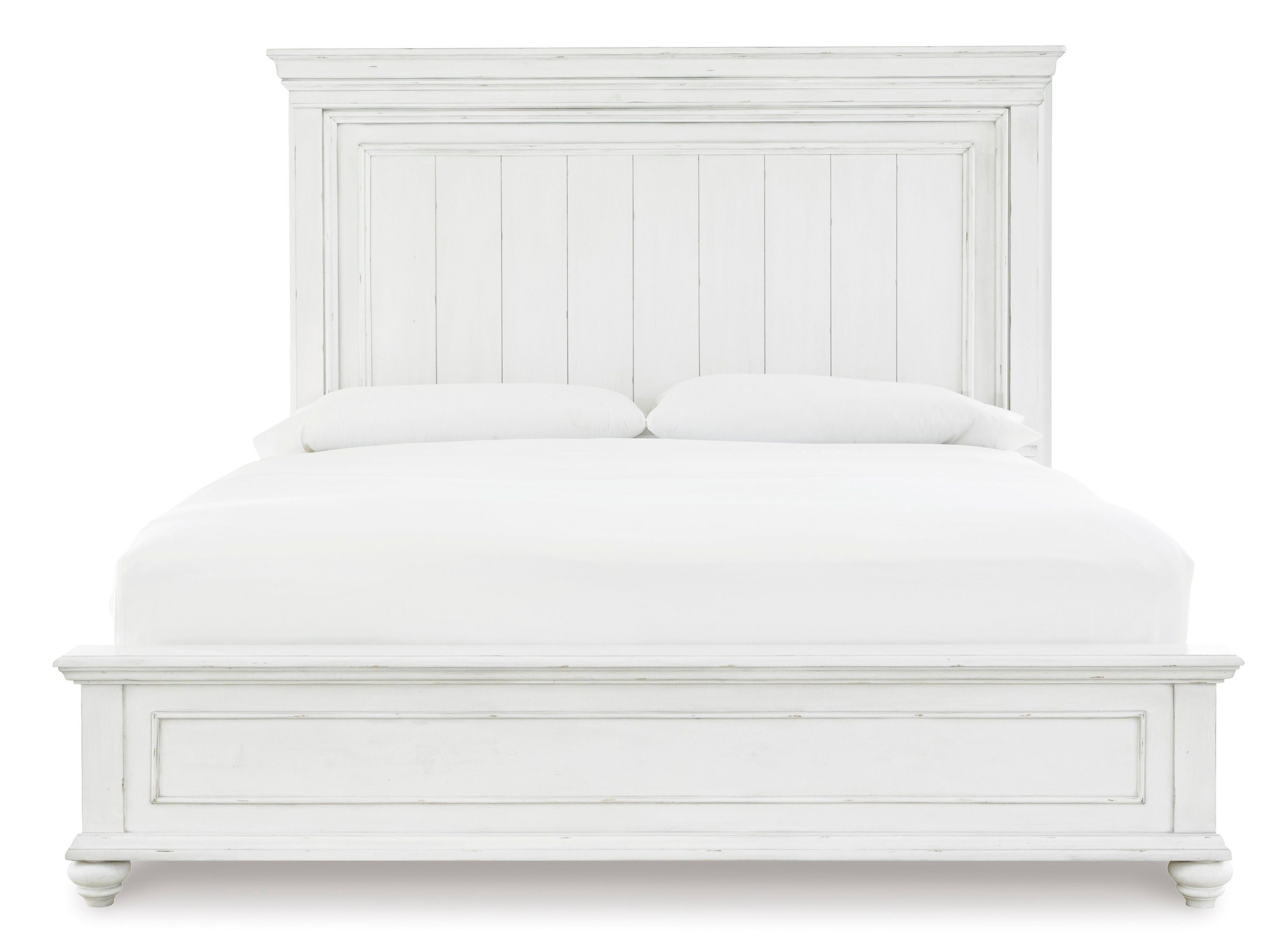 Give your retreat vintage charm with this king panel bed. In a beautifully distressed white-washed finish, you'll love the headboard's grand style featuring a picture framed panel. Generously scaled moulding from top to bottom, along with bun feet give this bed character—evoking the feel of a quaint cottage escape.
