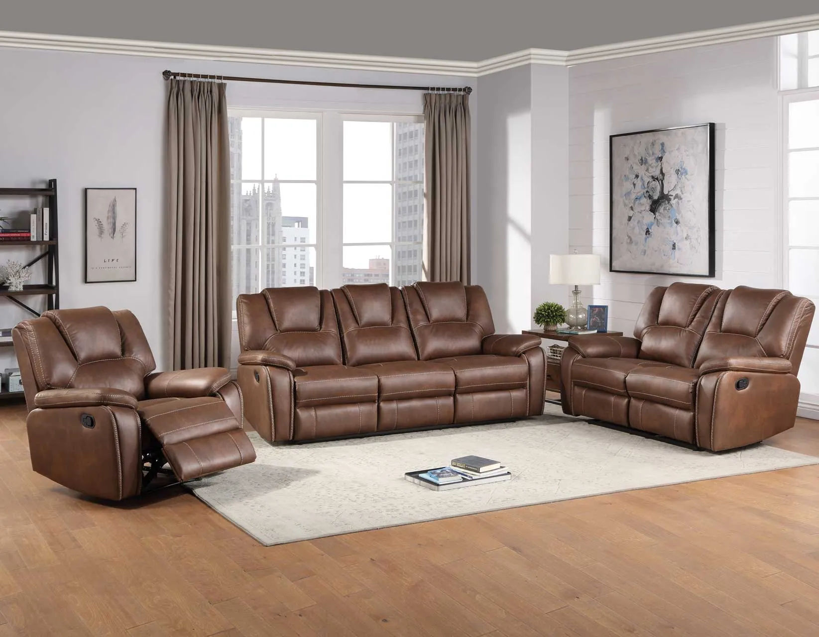 The Katrine Reclining Chair showcases the best in manual motion upholstery with this recliner that is sure to become your favorite seat in the house. The Recliner is covered in a luxurious chestnut brown faux-leather that features baseball stitching, padded armrests and a raised, padded headrest for a stylish and comfortable view and seat even when fully reclined.