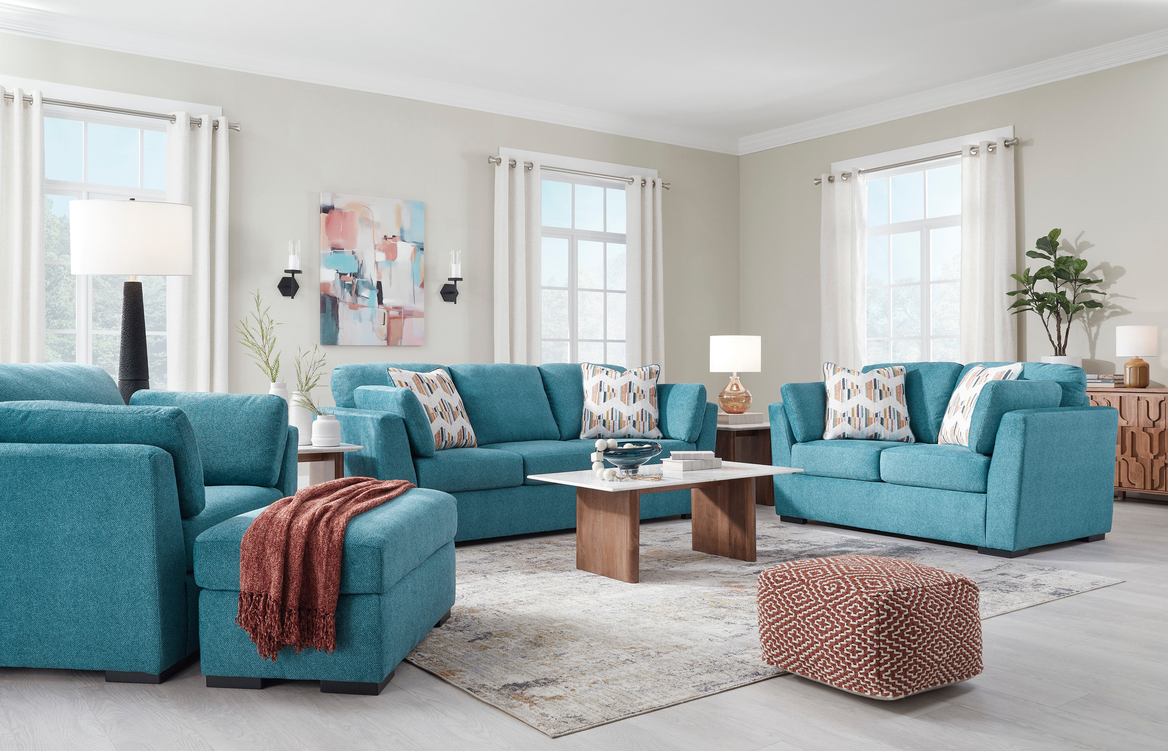 Add a pop of color to your living area with the Keerwick ottoman in teal fabric upholstery.