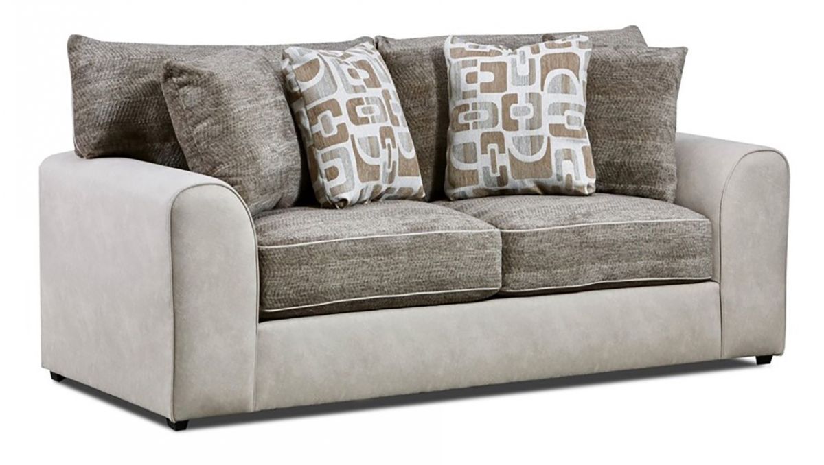 The Klein sofa features a two-type upholstery textured gray fabric covering the seats and back cushions, while light gray faux leather covers the base and armrests. The two-type upholstery creates visual interest and the four accent pillows help enhance the overall contemporary style of this Klein sofa. Two of the accent pillows have the same fabric upholstery as the seats and back cushions, the other two features a geometric design in a brown, beige and gray color scheme.