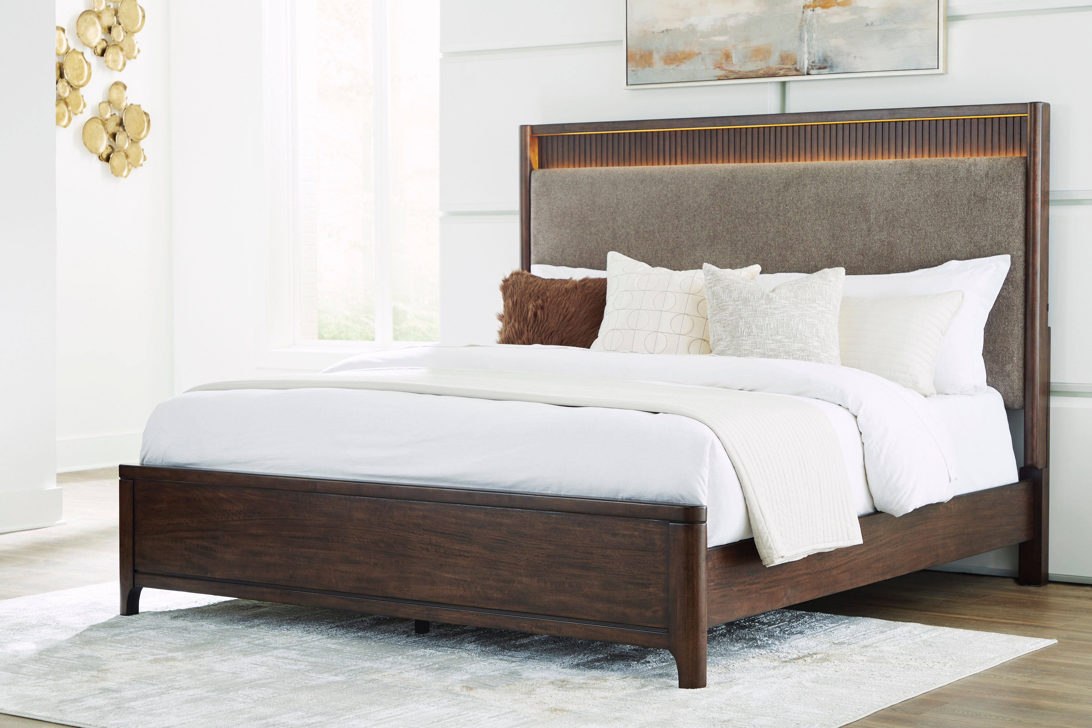 This queen upholstered panel bed exemplifies casual contemporary design with an urban vibe. Warm and inviting with a rich brown finish and soft tan upholstery, it makes winding down before bed that much sleeker thanks to an integrated LED light. A reeded accent panel on the headboard subtly nods to mid-century modern design. What a stunning reflection of your simple-meets-elegant sensibility.