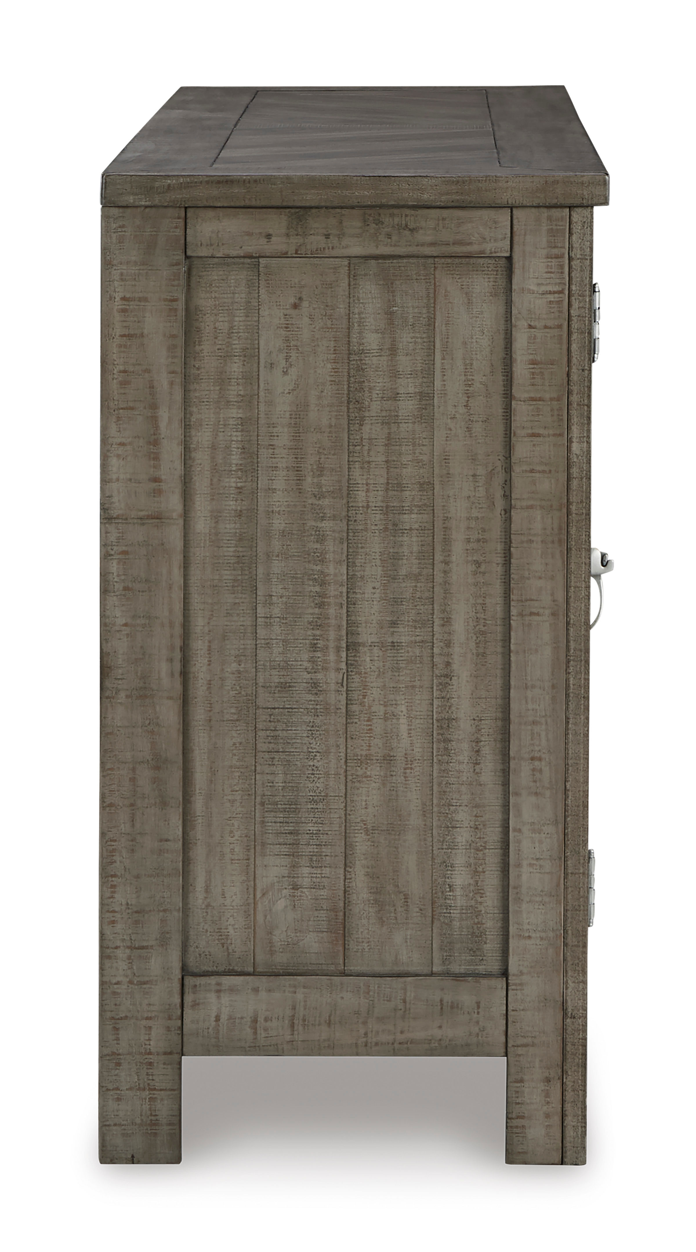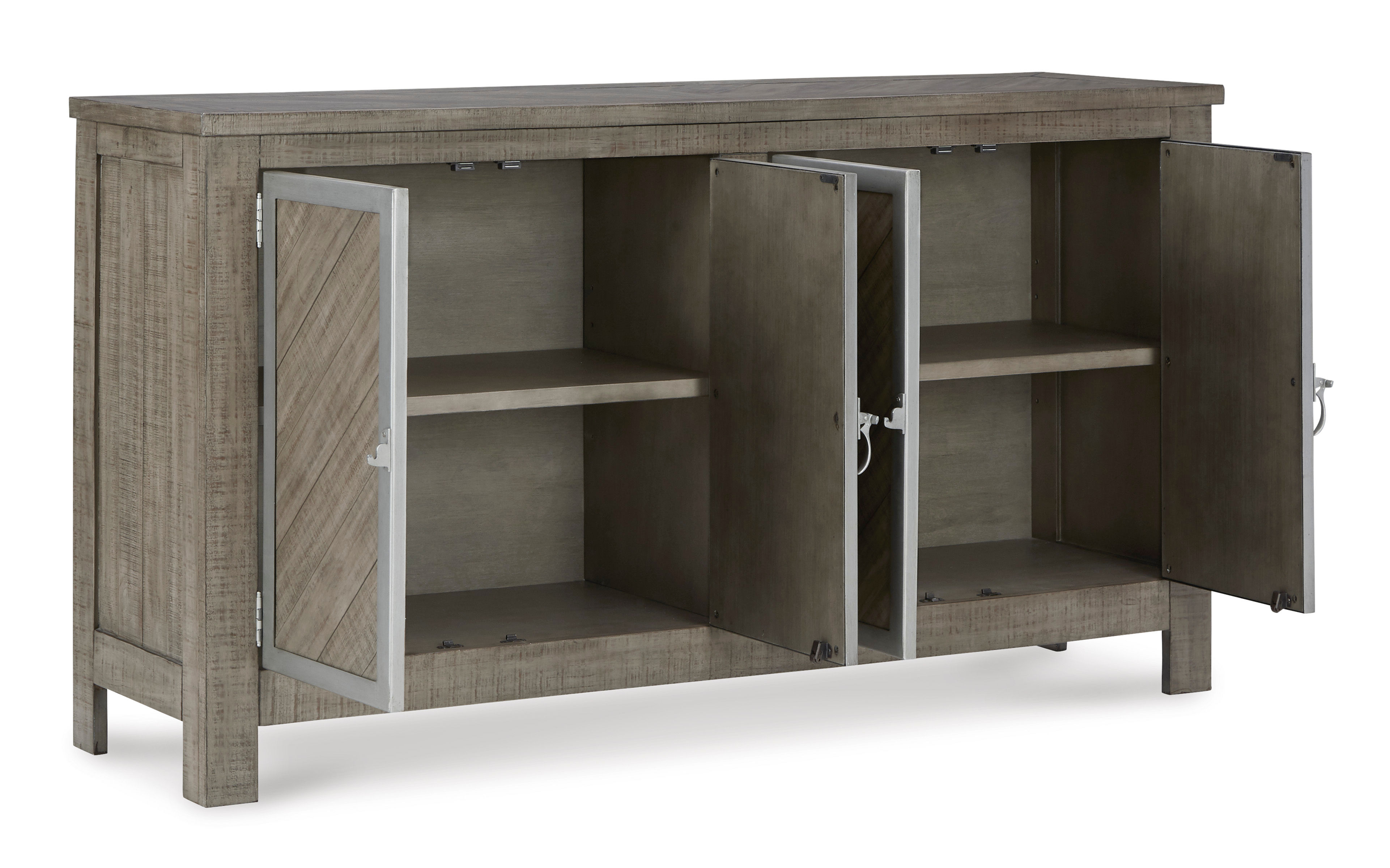 The use of mixed materials on the urban-inspired Krystanza double buffet makes it a true statement piece. Made of wood with metal accents, this buffet features two spacious cabinets, each with an adjustable shelf and metal-framed doors with trend-right window latches. A complex blend of stains and glaze create a weathered gray finish for a relaxed and harmonious update to your home.