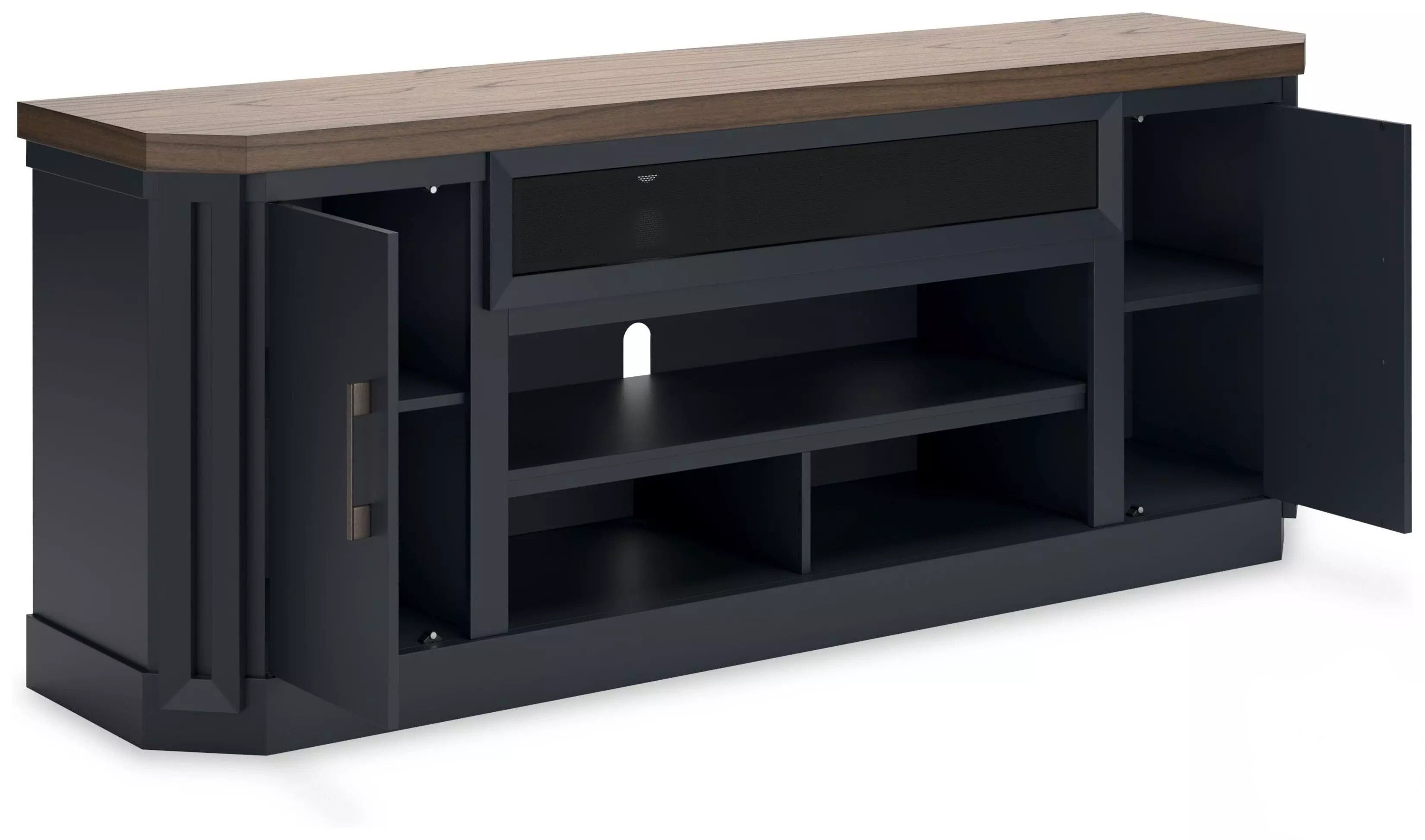The Landocken TV stand combines casual contemporary design with modern appeal. Its combination of a thick-bodied wood-tone top with a slate blue cabinet is a smart choice on so many levels. Stow away electronics in the roomy cabinets, and use the upper shelf to conceal a soundbar speaker for a clean integrated look. Enhancing the experience: the optional fireplace insert (sold separately) brings a touch of warmth and beautiful ambiance to your living room.