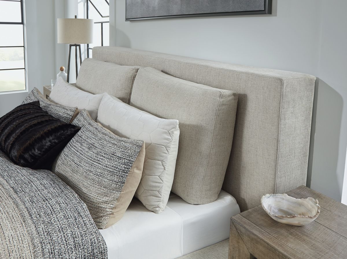 • Bed with neutral polyester upholstery; 2 loose bolster pillows with soft polyfill