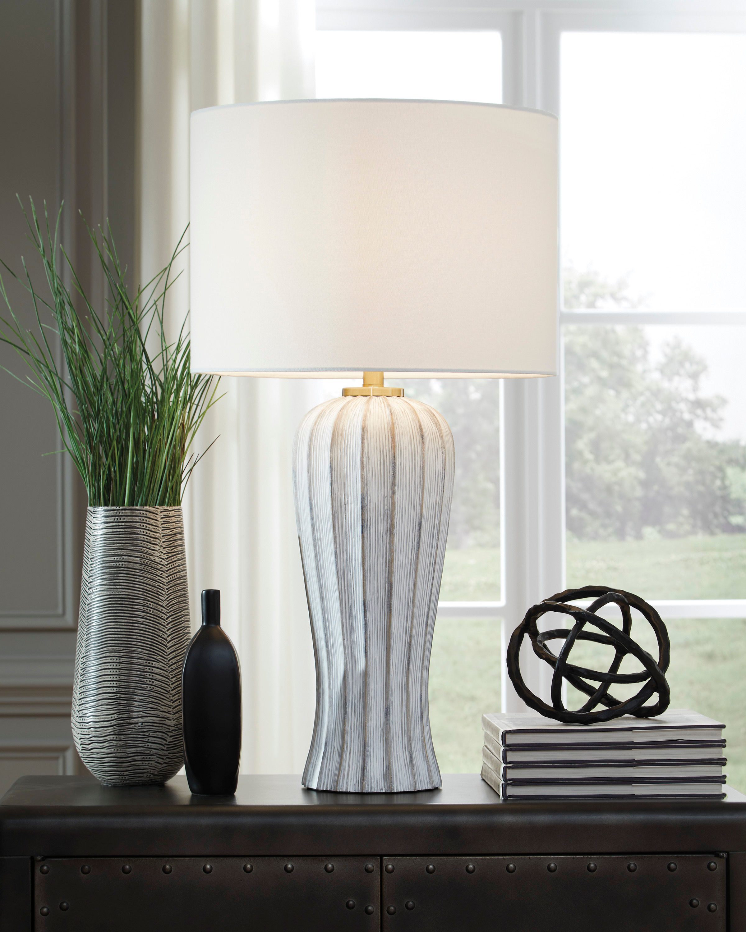 Classic sophistication meets modern sensibility. The gracefully fluted base of this table lamp brings a dynamic feel to the white shade's crisp look. Finished in a versatile antiqued gray, the transitional piece effortlessly bridges casual and contemporary design.