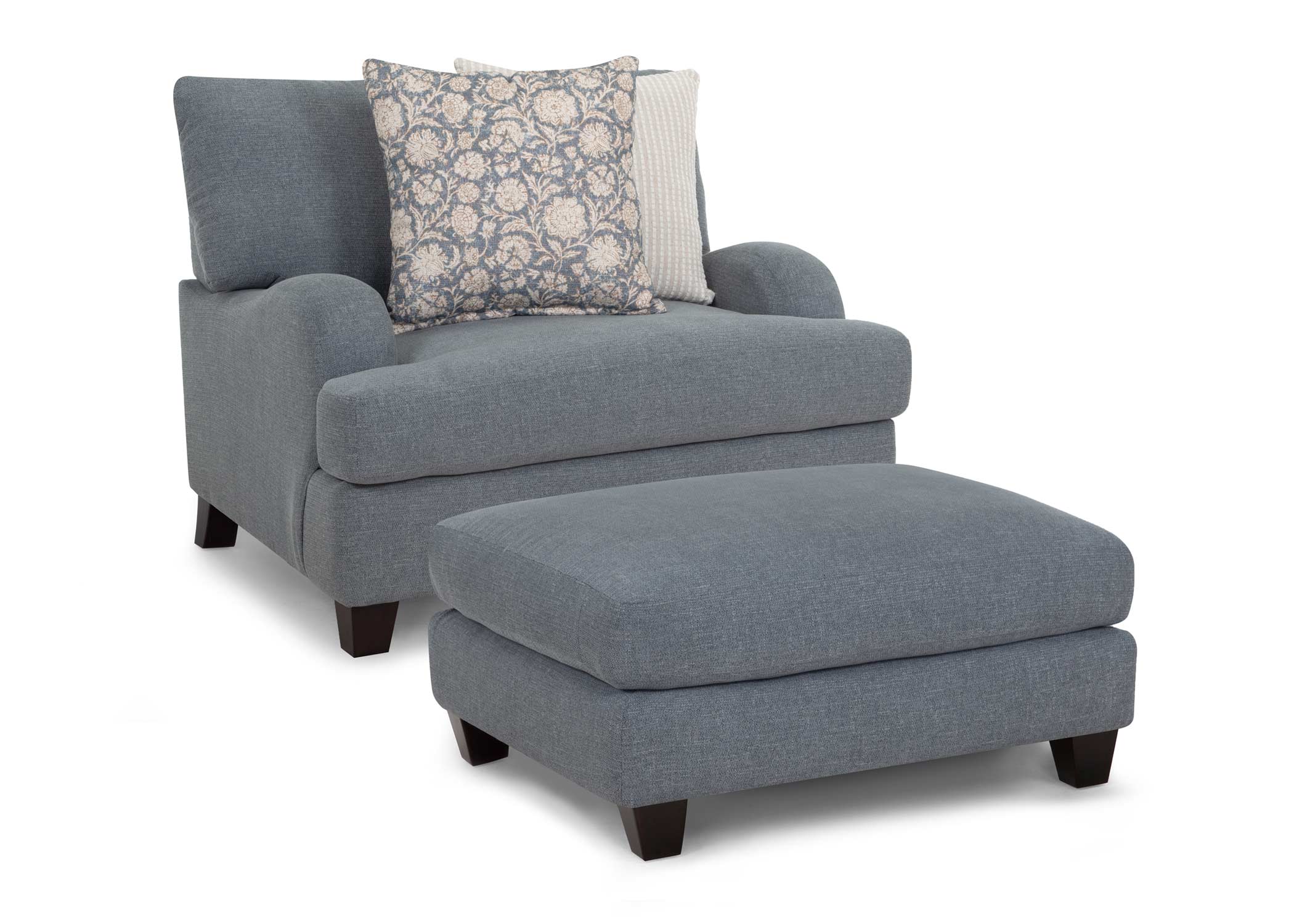 Timeless elegance meets everyday comfort in the Laurel Chair and a Half. This inviting accent chair is upholstered in a durable gray-blue fabric. Coordinating throw pillows in timeless patterns and soothing hues enhance the aesthetic, adding a touch of warmth to the group. Solid wooden legs complete the look and offers support and a polished finish. The Laurel features our WOW Seating System, which combines precision-cut wood frames with gel-blended foam seating for exceptional support. The reversible seat and back cushion are designed to be flipped, allowing for even wear and extending the lifespan of your furniture. Whether you’re entertaining guests or enjoying a quiet night in, the Laurel Chair and a Half delivers classic comfort with a modern touch.