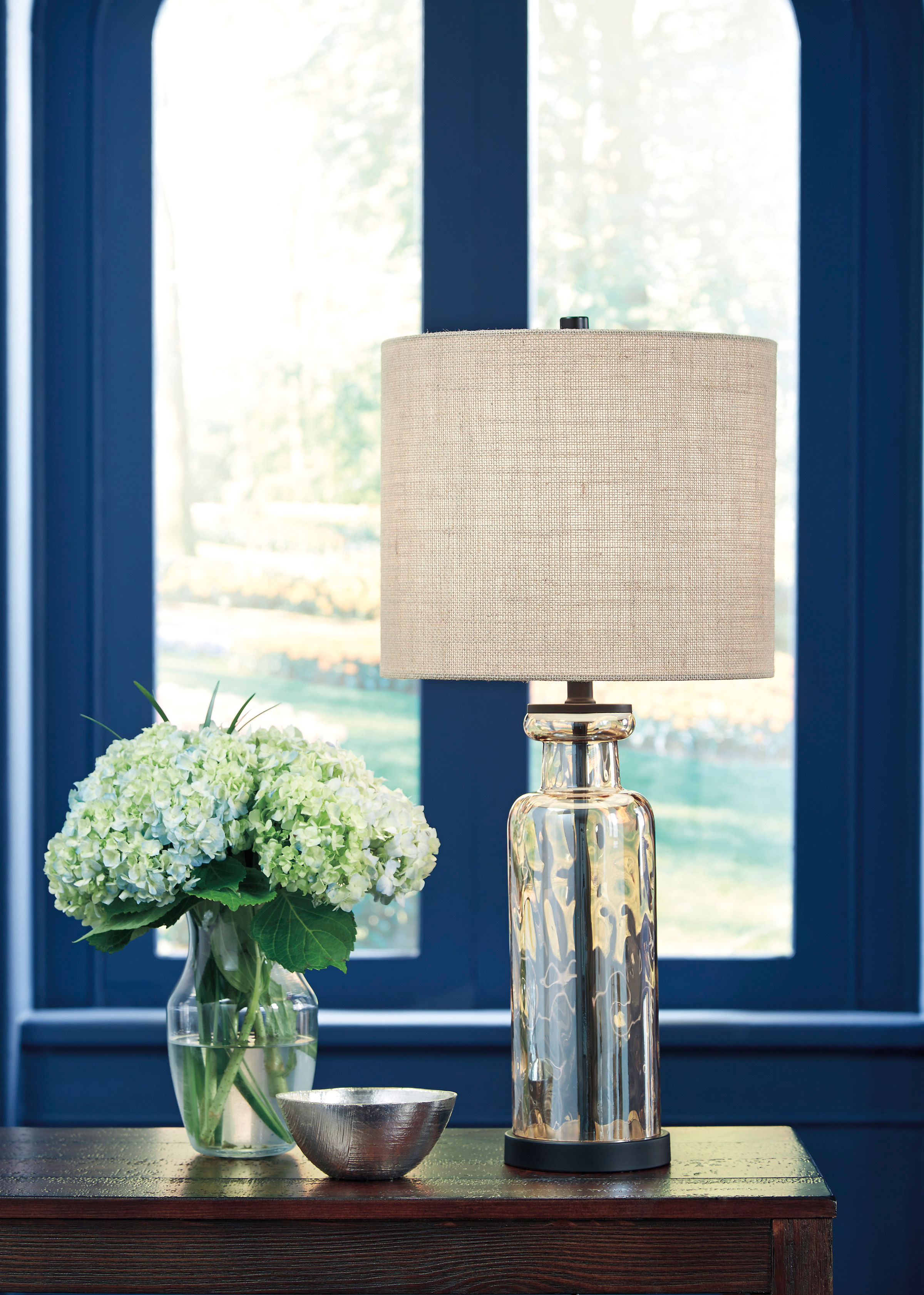 Transparency is in style with the Laurentia table lamp. A unique pattern reflects in the faceted base as light passes through. Antique bronze-tone metal beautifully complements the champagne glass finish. Burlap shade adds texture to the smooth design.