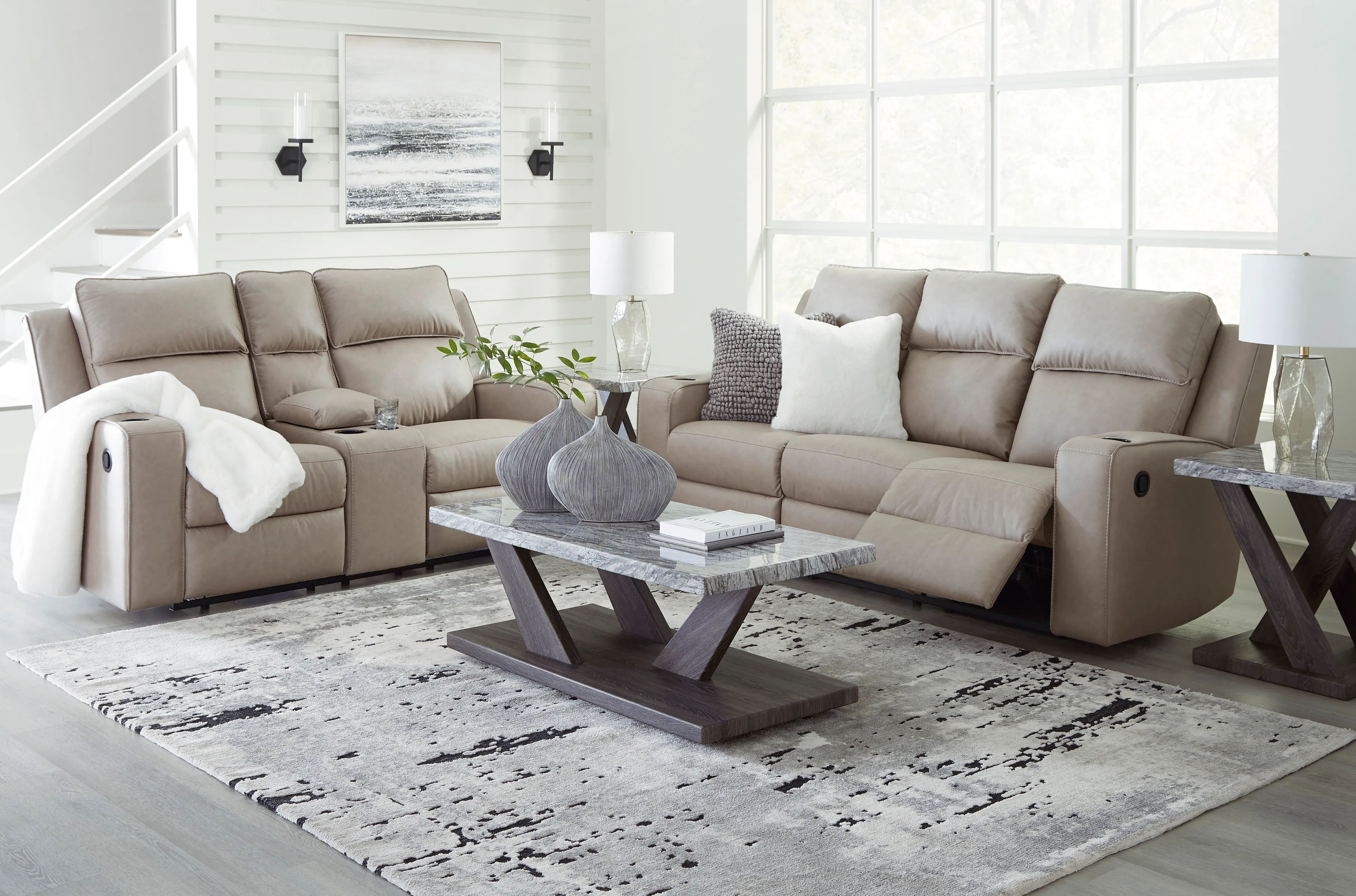 Indulge your lust for comfort and love for contemporary design with the Lavenhorne reclining loveseat. Made for easy everyday living, it’s upholstered in a heavyweight padded faux leather and accented with contrast jumbo stitching for fashion-forward flair. Sleek track arms elevate the look with a touch of modern sensibility. A padded center console with dual cup holders completes the experience.