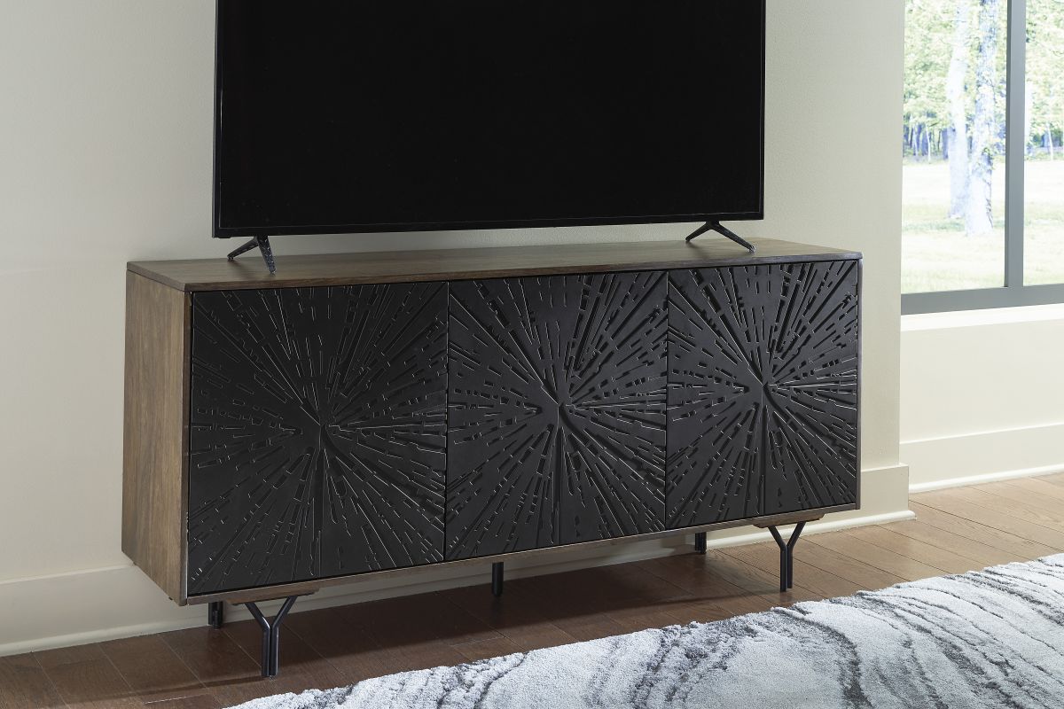 This accent cabinet combines classic function with elevated styling. Its ultra-sleek linear profile channels contemporary aesthetics, with the dark two-tone look lending a luxurious feel. Crafted with stunning mango wood, the carved sunburst pattern reflects superb attention to detail and refined craftsmanship. And for added function, push magnet doors gently open to reveal spacious storage.