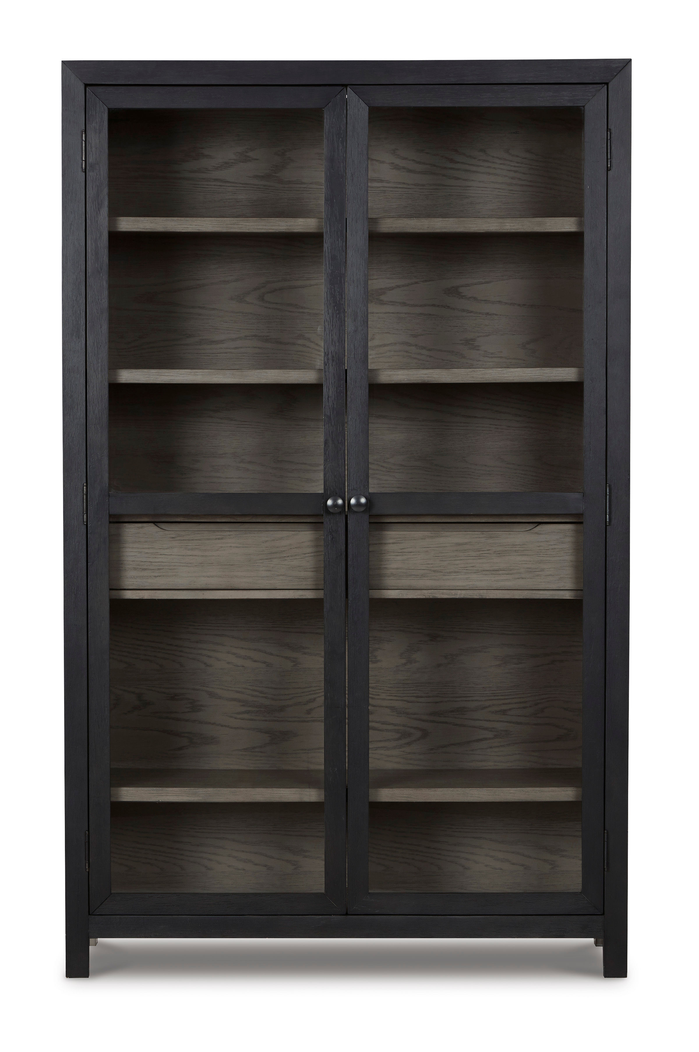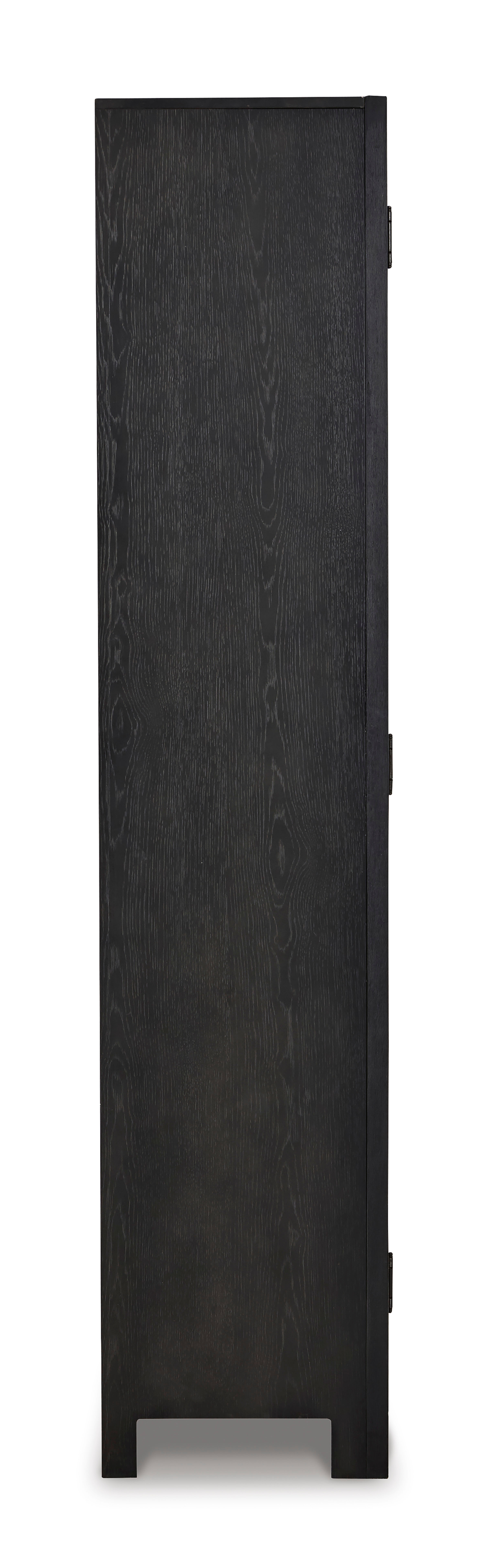 Embrace contemporary style, the Lenston accent cabinet has a black exterior and warm gray interior.