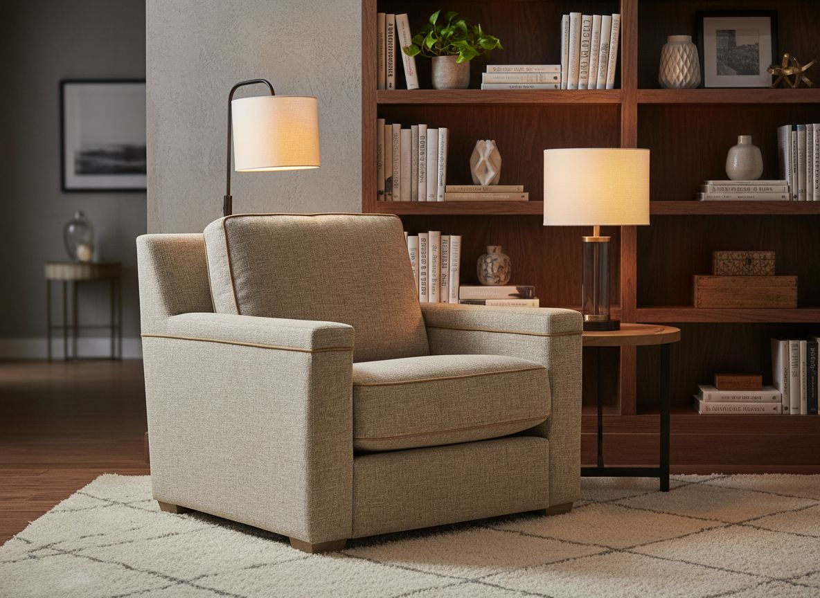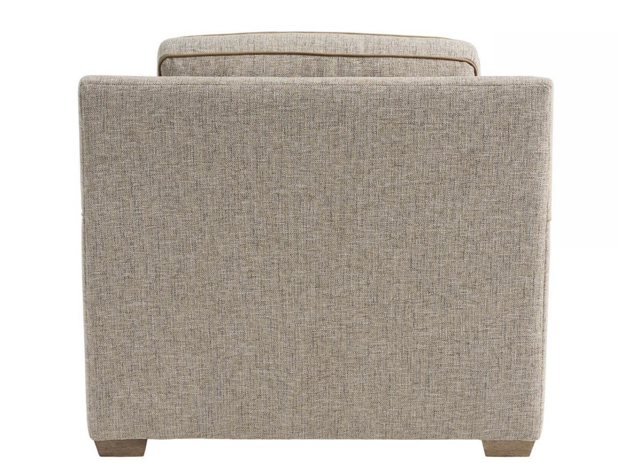 The Liam chair in the image is a modern, upholstered armchair featuring clean lines and a neutral beige fabric with subtle texture. The design includes a generously padded seat and back cushion for enhanced comfort, both outlined with a contrasting piping that adds a touch of refinement. The squared arms and low-profile wood legs give it a contemporary yet timeless look, making it suitable for a variety of interior styles.