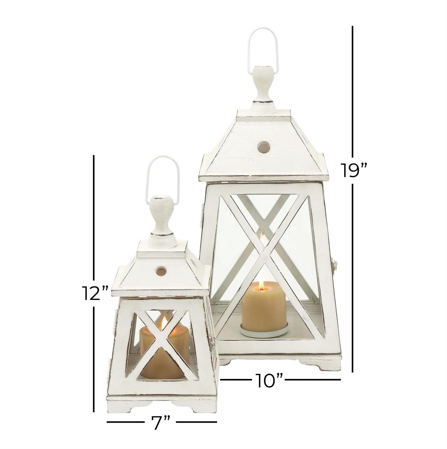 Inspired by blissful serenity and the allure of the sea, where soothing hues and natural textures bring effortless charm to the home. The white indoor outdoor candle lantern set is crafted from iron and fir wood for a durable and stylish structure. This cone decorative candle lantern set features a distressed white finish with clear glass panels and silver accents that add an elegant touch. The metal set of 2 candle lanterns features a coastal-inspired design with secure latched doors, adding a touch of elegance.
