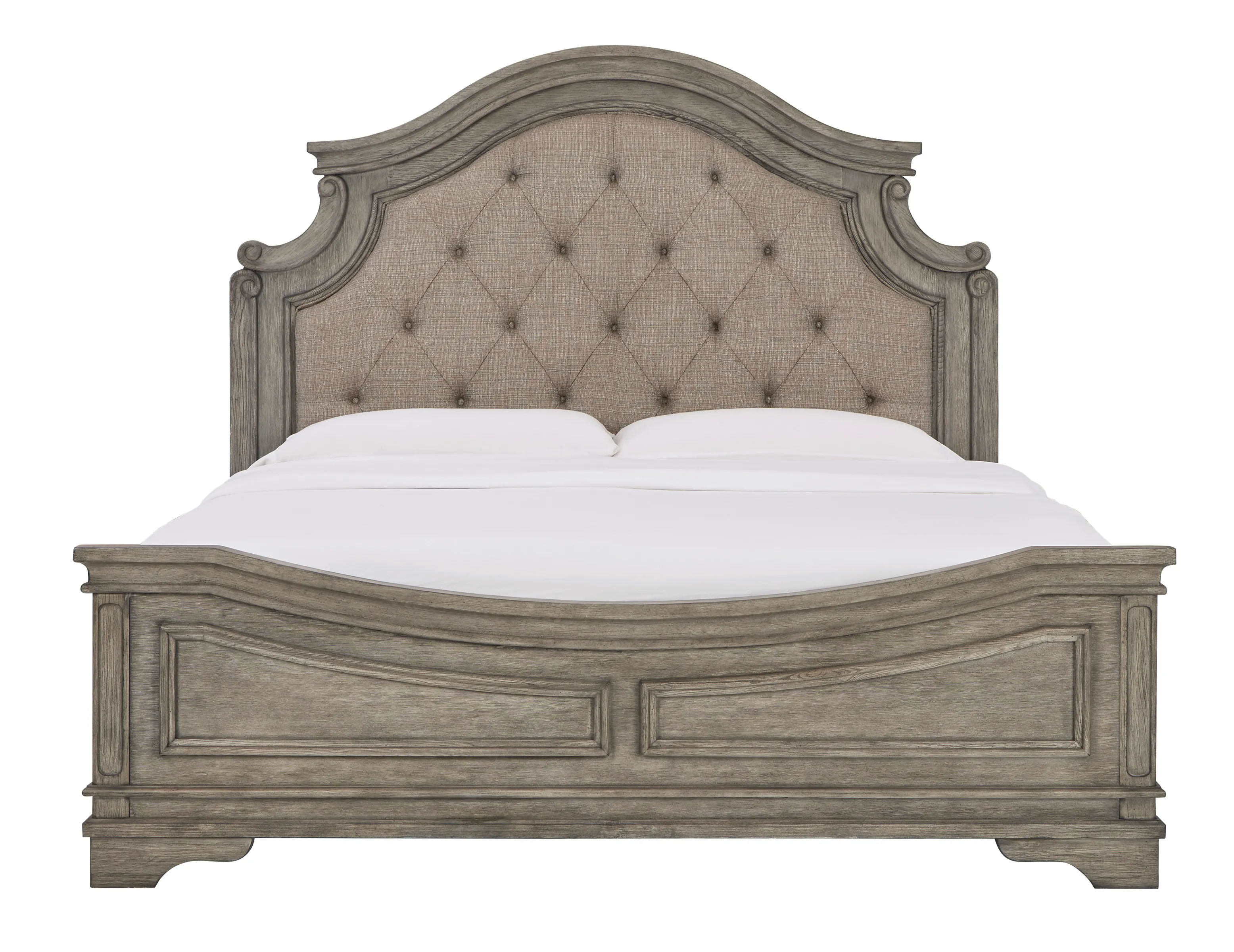 Cottage quaint styling and quality construction make the Lodenbay king panel bed a dream come true. An antiqued gray finish and beige upholstery provide rustic warmth. The ornately shaped headboard marries classic design with homey charm for an elegant bedroom must-have.