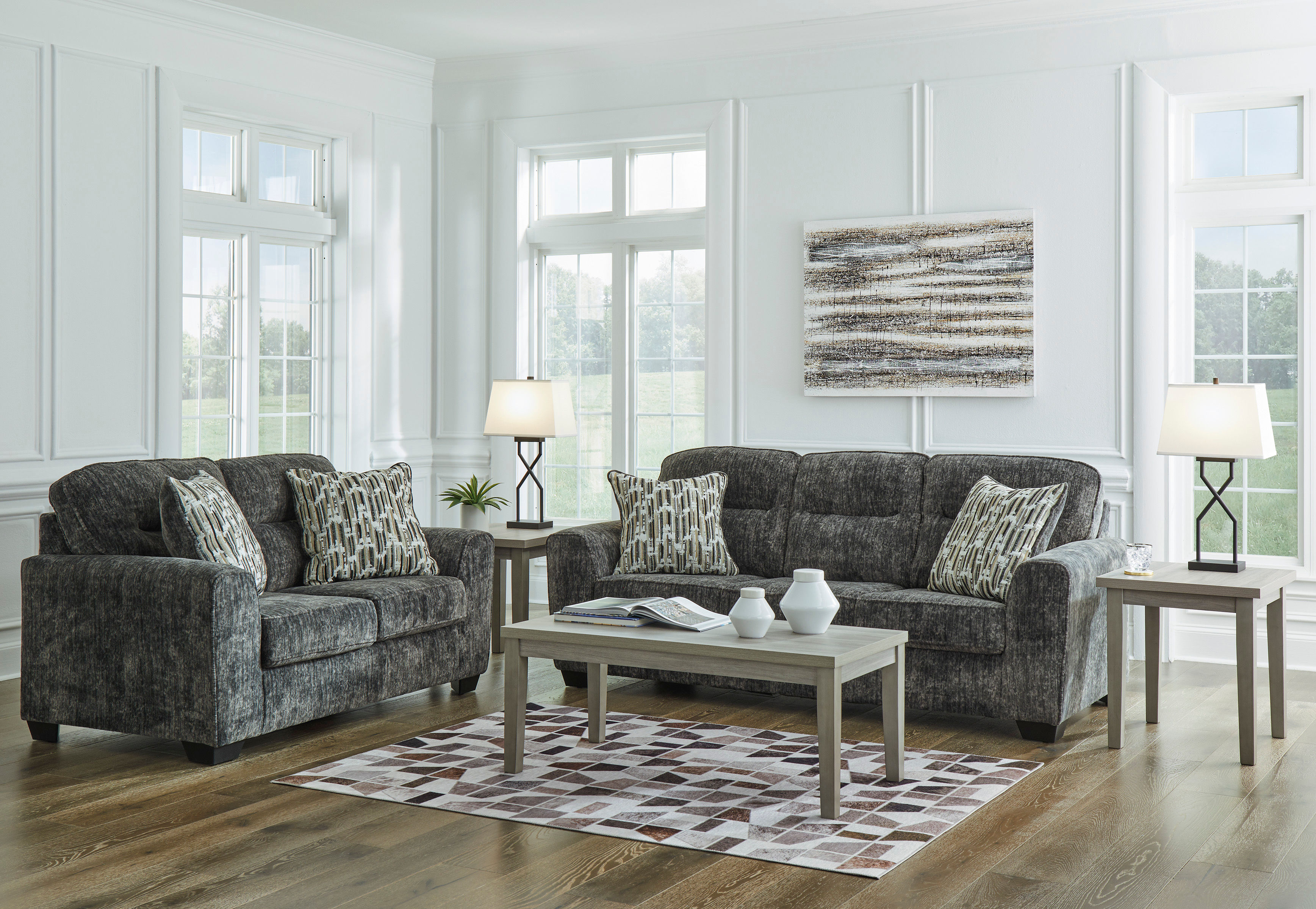 The Lonoke loveseat speaks to those drawn to fresh, contemporary style with richly neutral appeal. Subtle and sophisticated, the plush upholstery and dark tri-block legs are a natural complement for so many color schemes. Two accent pillows make the seating even more welcoming. Curling up on this loveseat to enjoy a night in is never out of the question.