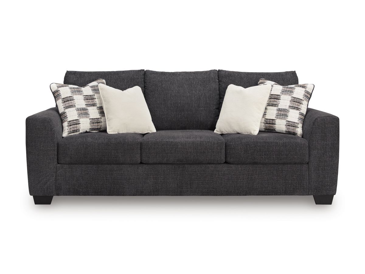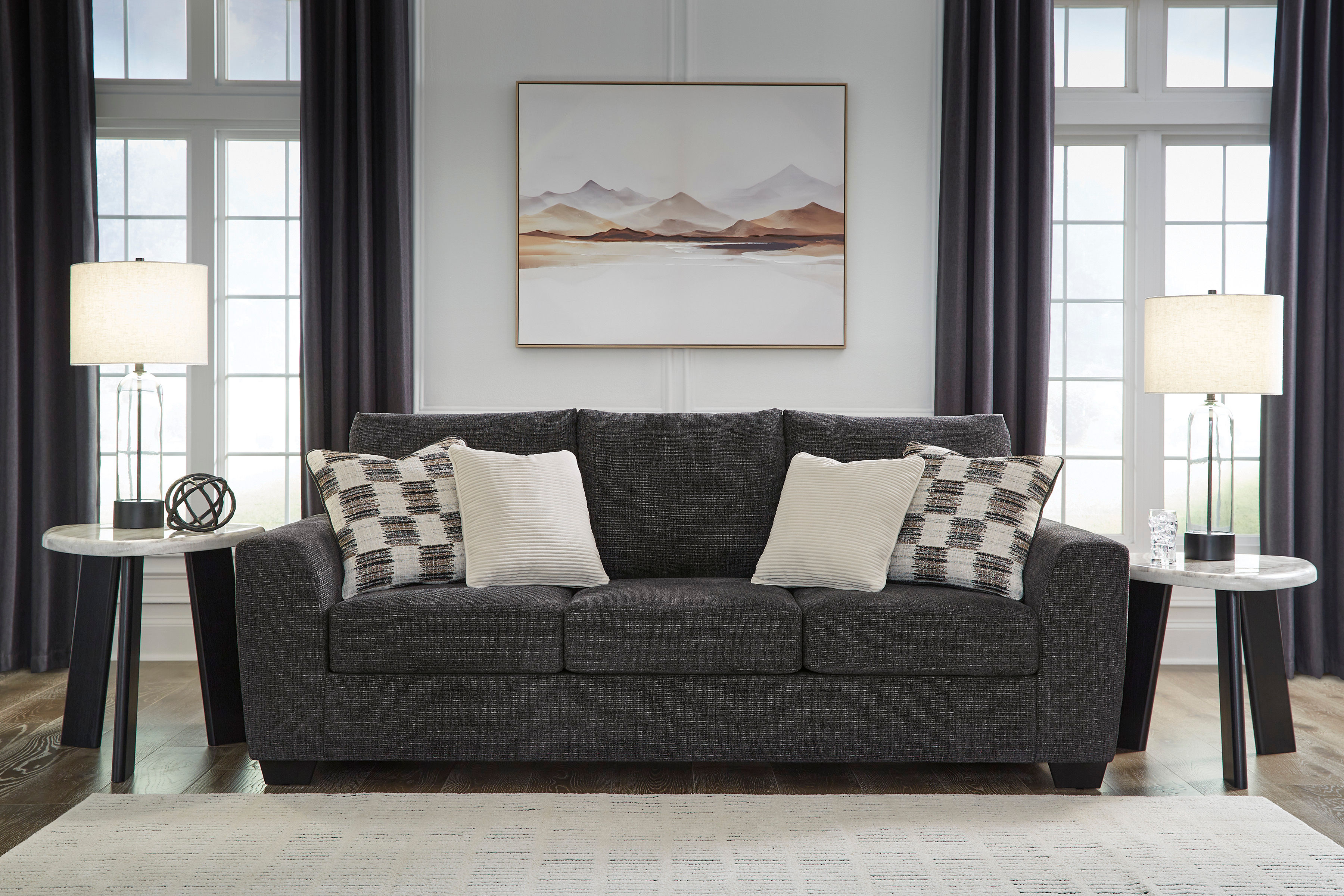 This sofa personifies contemporary comfort. Its clean-lined frame and neutral color lend must-have versatility. Softly textured fabric makes it that much more inviting. A welcome combination of chic style and a cozy feel, this piece completes your living room with modern flair.