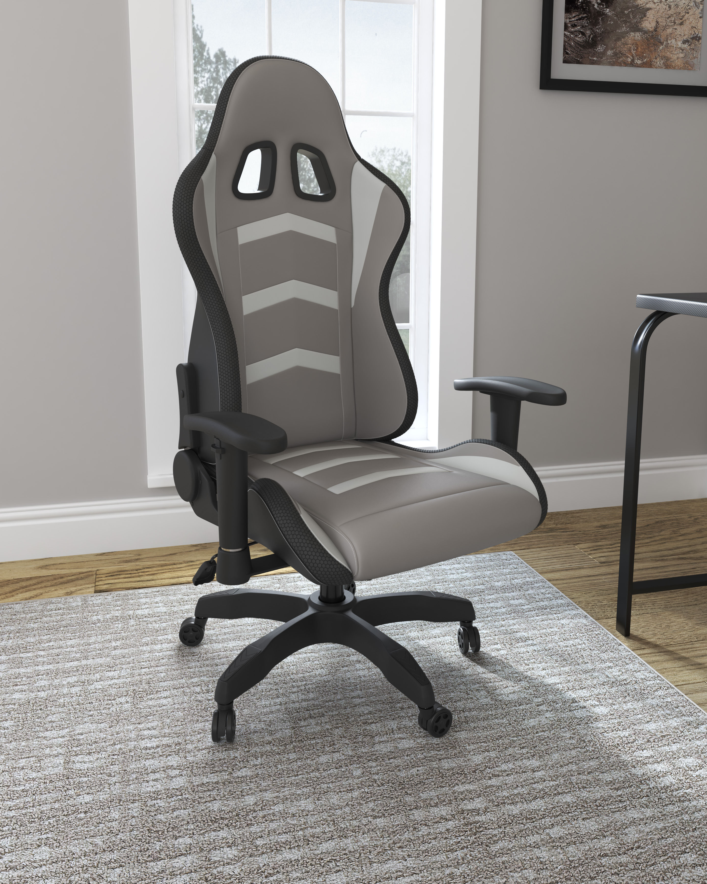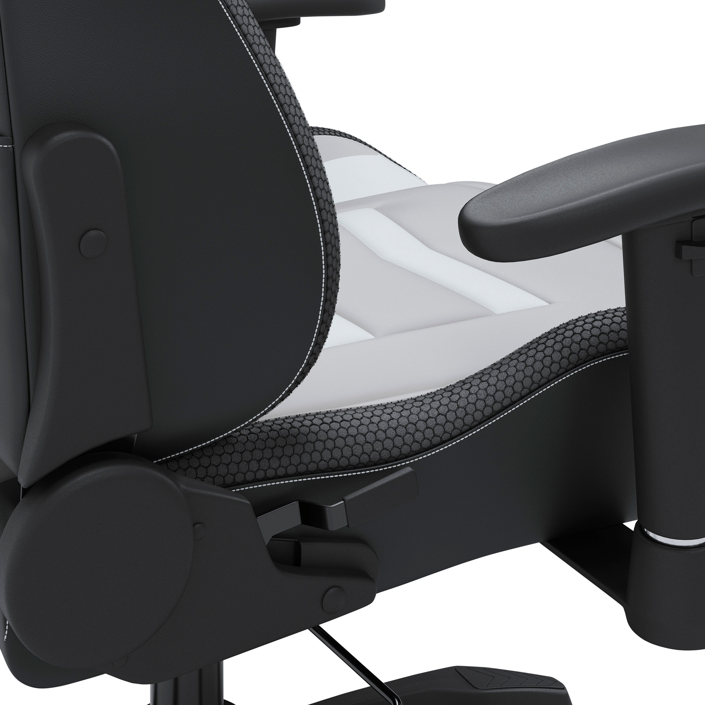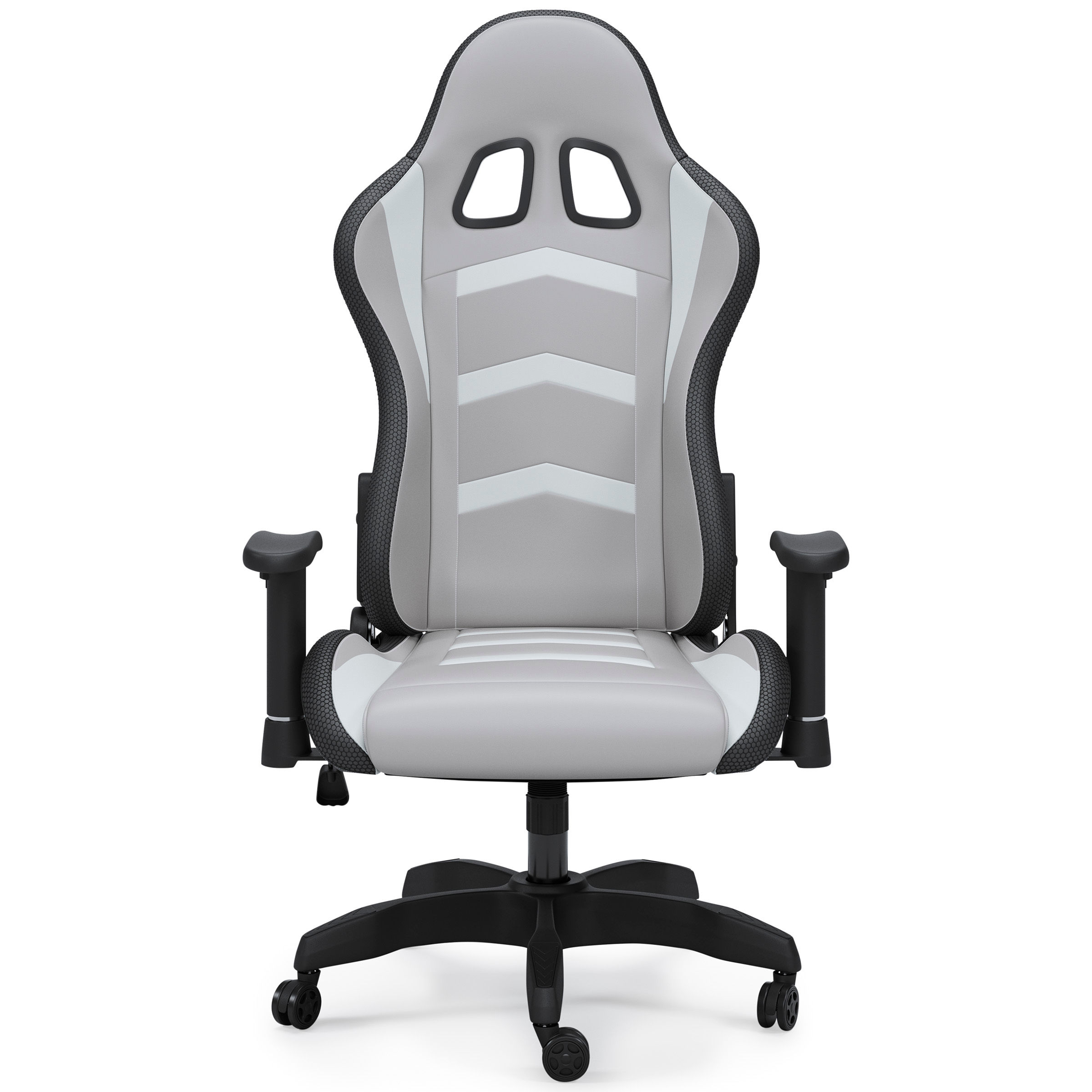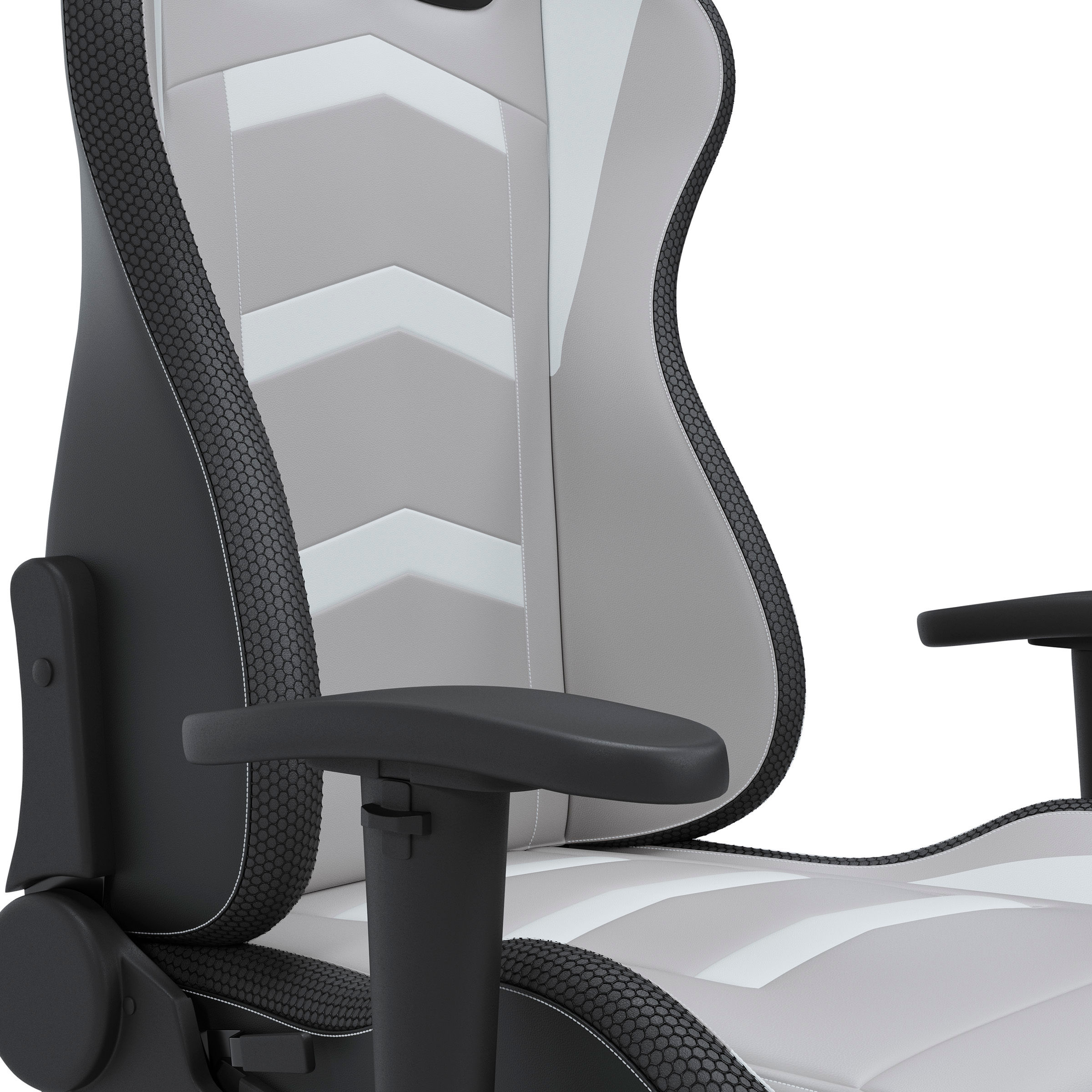Tech this out: a swivel office chair that’s as cool as it is comfortable. The ultimate choice among gamers, the Lynxtyn swivel office chair is hard to beat. Quality crafted with a sturdy steel frame, this swivel office chair with comfy contoured seat and cutting-edge design is upholstered in a durable faux leather in white and gray. Cleverly integrated into the chair: powered LED lighting to enhance the gaming experience. Choose from six different colors or stream a mix of color using the remote control. With a swivel base, smooth-gliding casters and adjustable seat height/tilt feature, this office chair with fully reclining backrest has serious game.