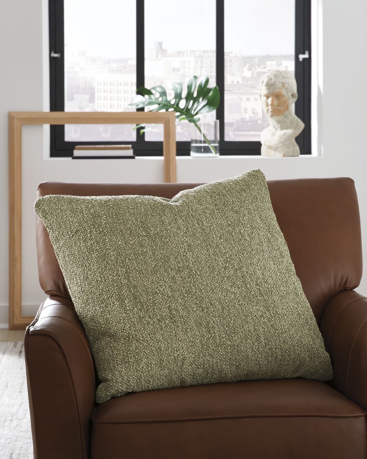 Create a stylish foundation for your cozy living room decor. This reversible pillow completes your seating area with approachable, versatile character. Inviting with a softly textured boucle fabric in olive green, it acts as a chic companion for other textiles.