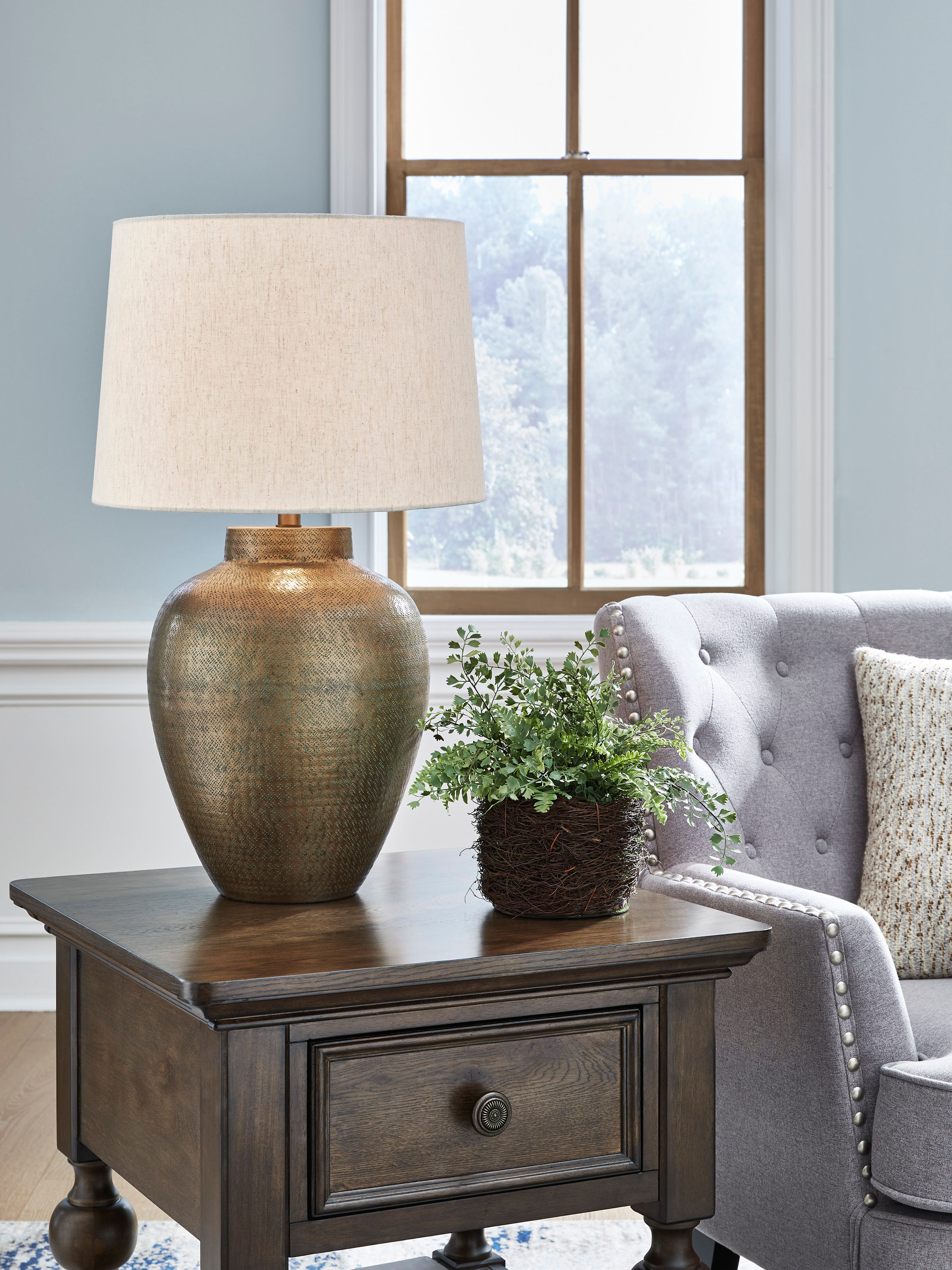 Stay on trend with lighting that exudes artisan refinement. Crafted from hammered aluminum with a goldtone patina finish, the Madney table lamp fills a room with well-lit splendor. Simple in shape, it adds striking texture to your home.