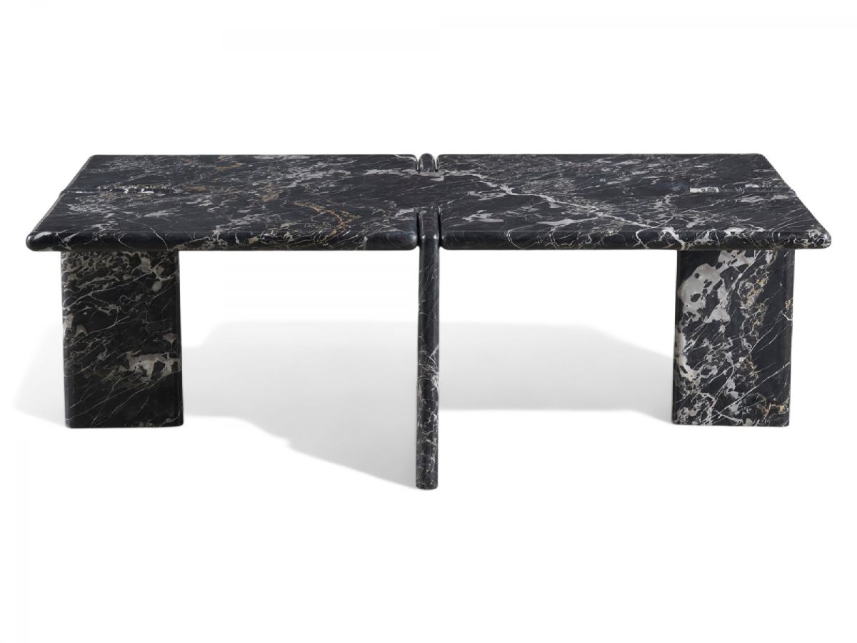 The Magnus Cocktail Table stands as a bold centerpiece, crafted from deep black Golden Portoro Marble. Its robust, sleek silhouette commands attention, with slab-like legs that accentuate an intricate play of stone and form. This table is a statement of elegance and strength, perfectly blending luxurious materials with a commanding presence.