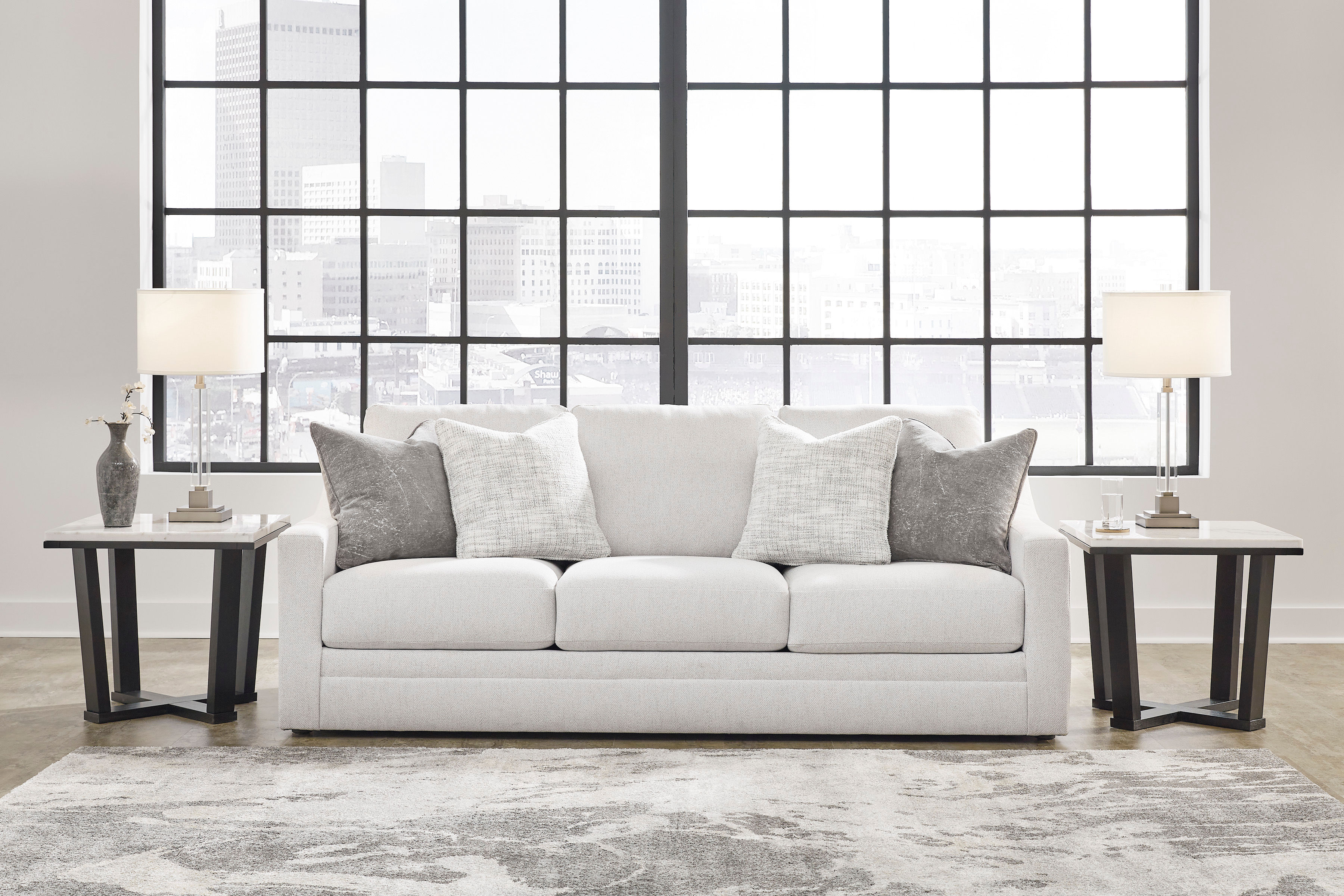 Clean lines and a streamlined silhouette define the architectural attitude of the Maitelynn sofa. Textured accent pillows in complementary colors add subtle contrast, while plush reversible cushions beckon your body to sit down, get comfy and relax completely.