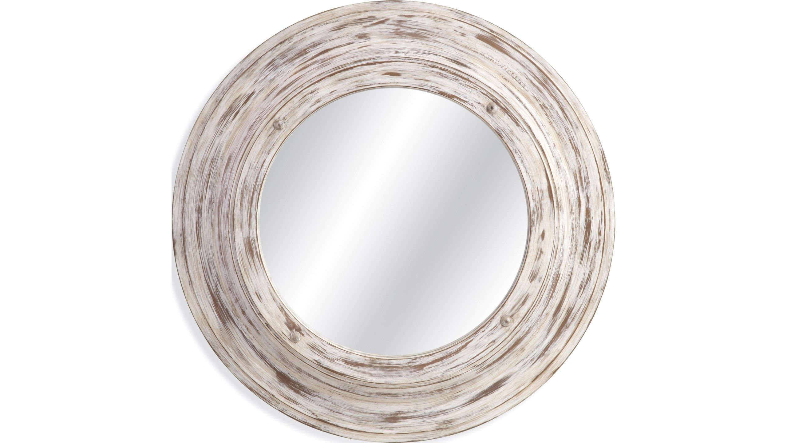 Embrace the essence of modern farmhouse charm with the Mallory round accent mirror, encased in a vintage-inspired white frame, offering a timeless accent that effortlessly blends rustic warmth with contemporary elegance, perfect for adding character to any space.
