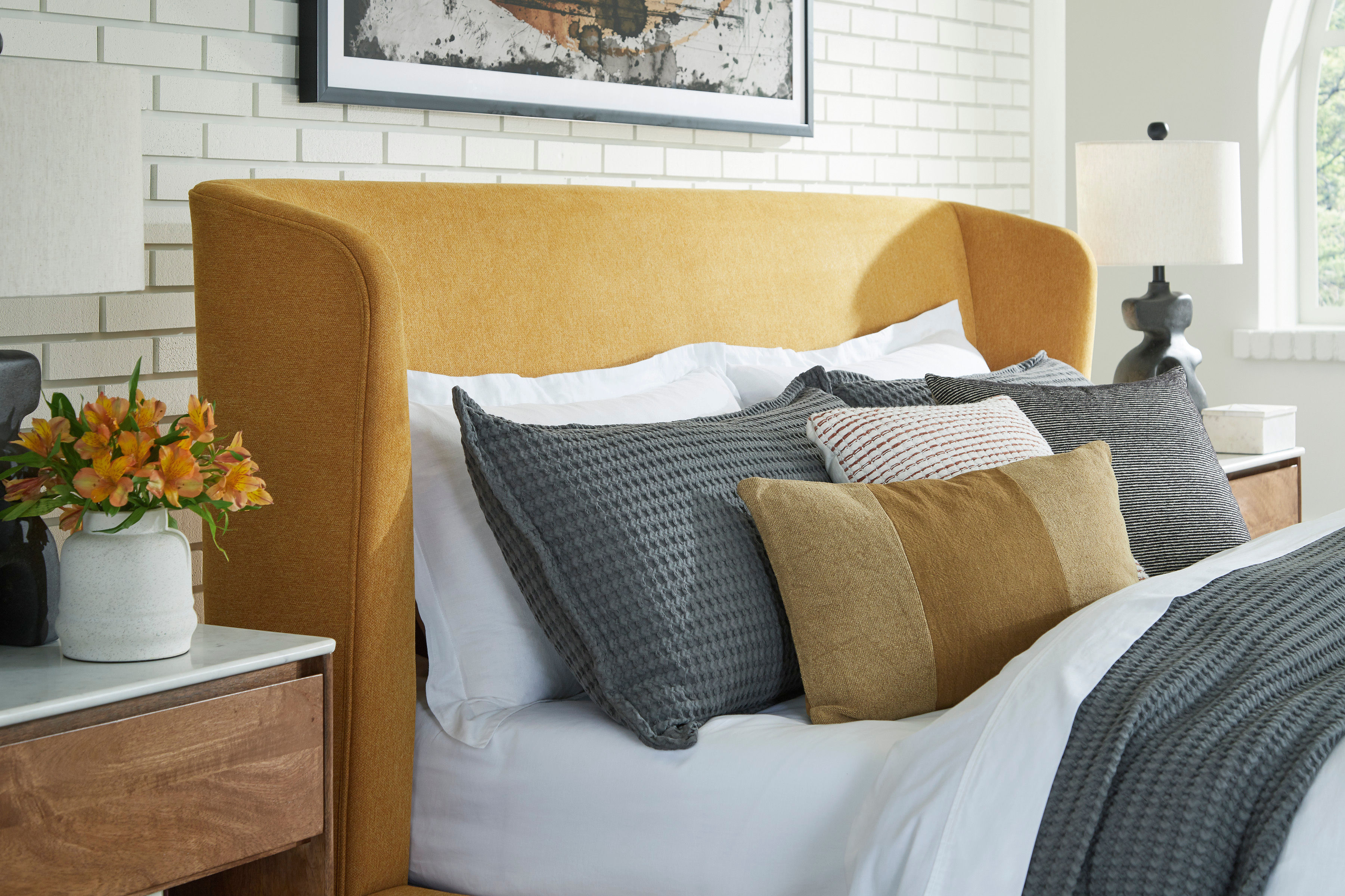 Maloken King Upholstered Bed with Roll Slats, Mustard, large