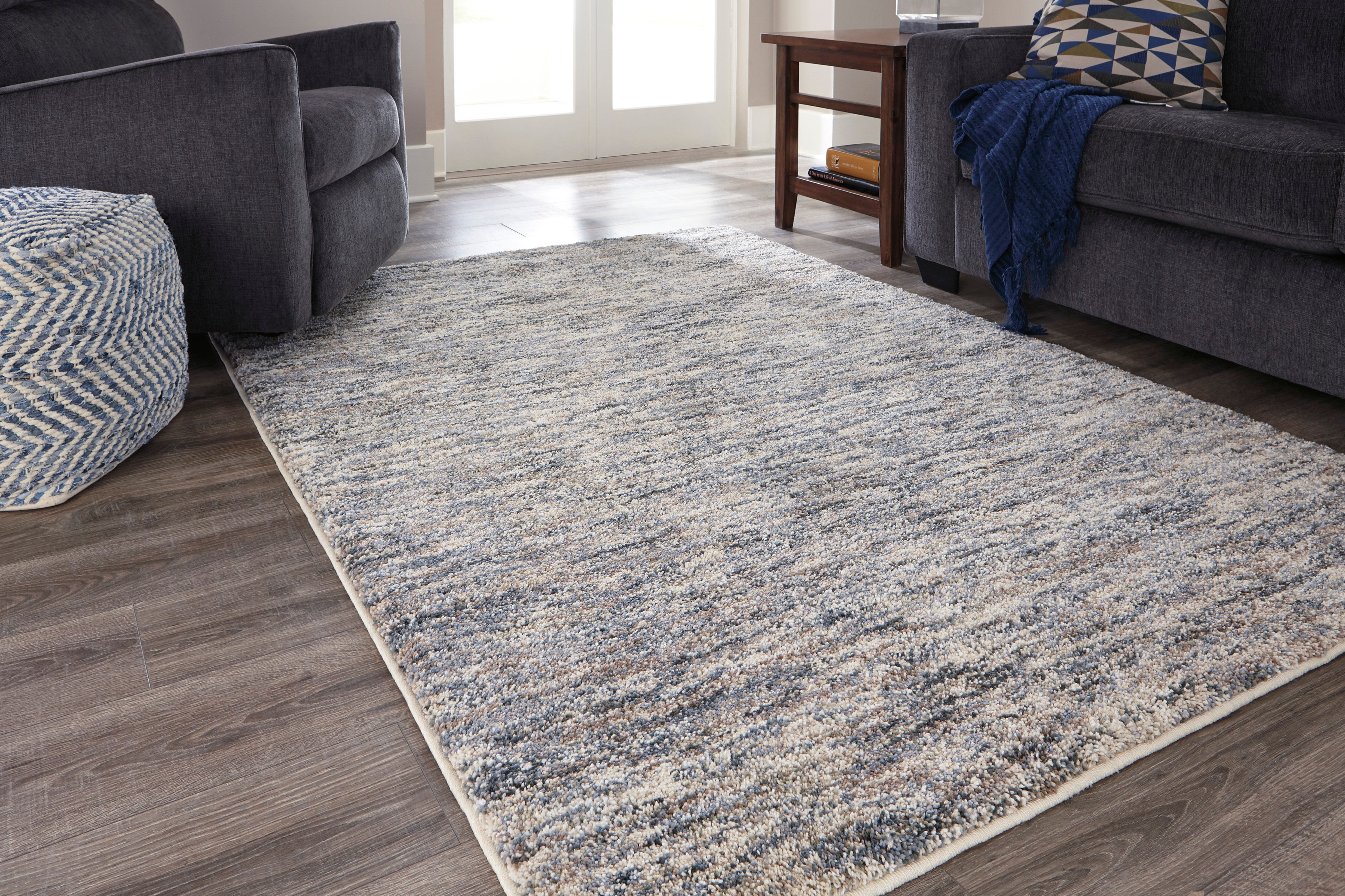 The multi-tonal Marnin accent rug has neutral tones in a variegated design.