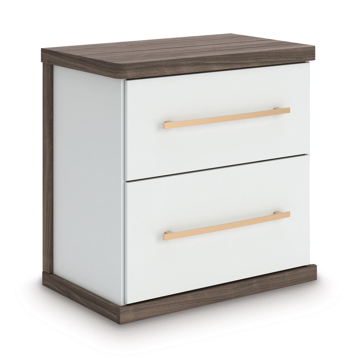 Looking to make a subtly striking statement in your bedroom? We've got you covered. This nightstand’s sophisticated two-tone treatment marries a warm brown finish over replicated walnut grain with a matte white finish. Rounded corners and a thick top radiate an air of modern panache, while sleek handles in a champagne finish add a sparkling touch to the spacious drawers. And built-in USB charging keeps your gadgets powered up. It’s a master class in contemporary yet comfortable character.