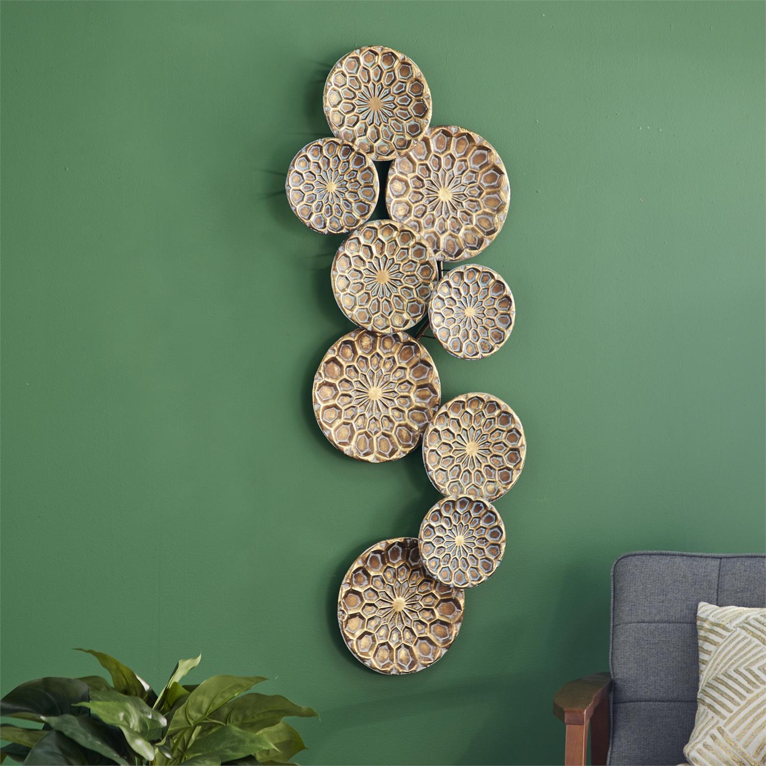 • Satin gold wall art for living room features round, concave plates adorned with intricate floral designs, offering a tasteful blend of elegance and charm