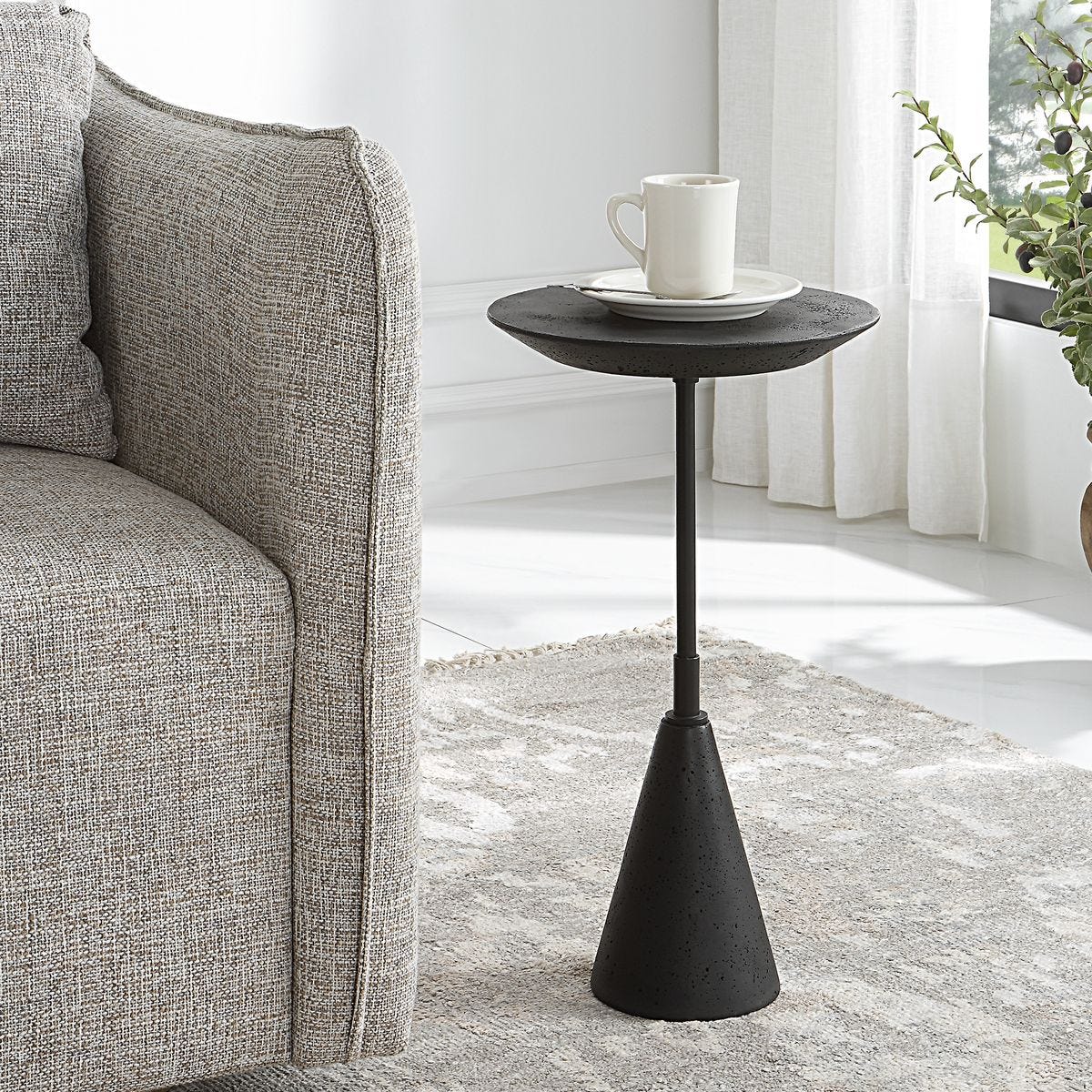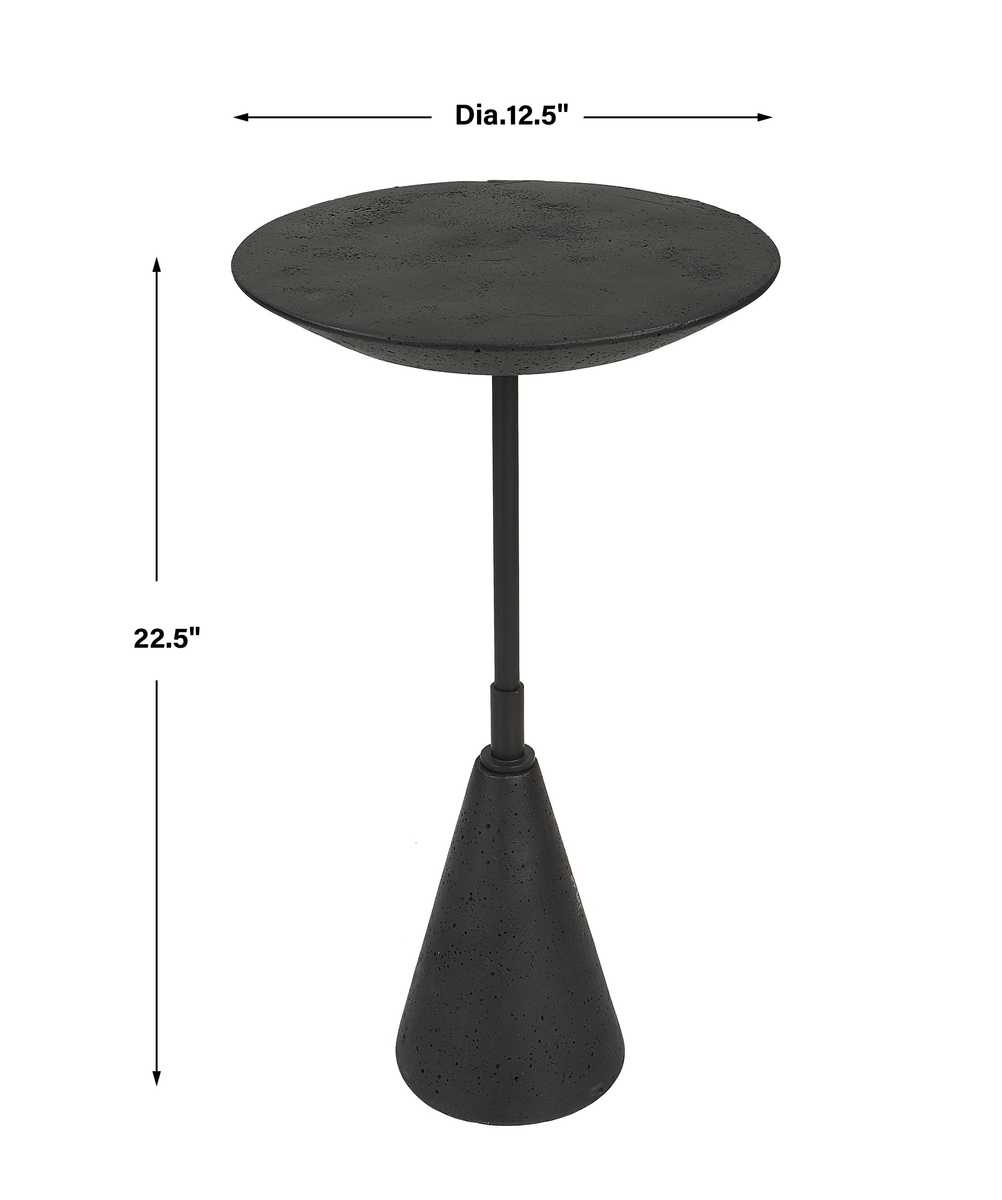 This accent table makes a dramatic statement with its sleek, all black design. The slim steel rod is accented by a black man-made stone top and foot with a noticeably porous texture.
