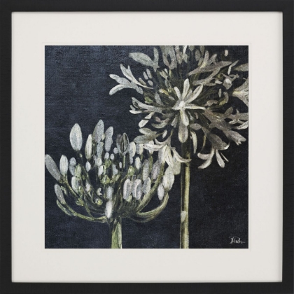 White lilies pop against a dark backdrop. Double-matted in white and framed in a black block contemporary moulding.