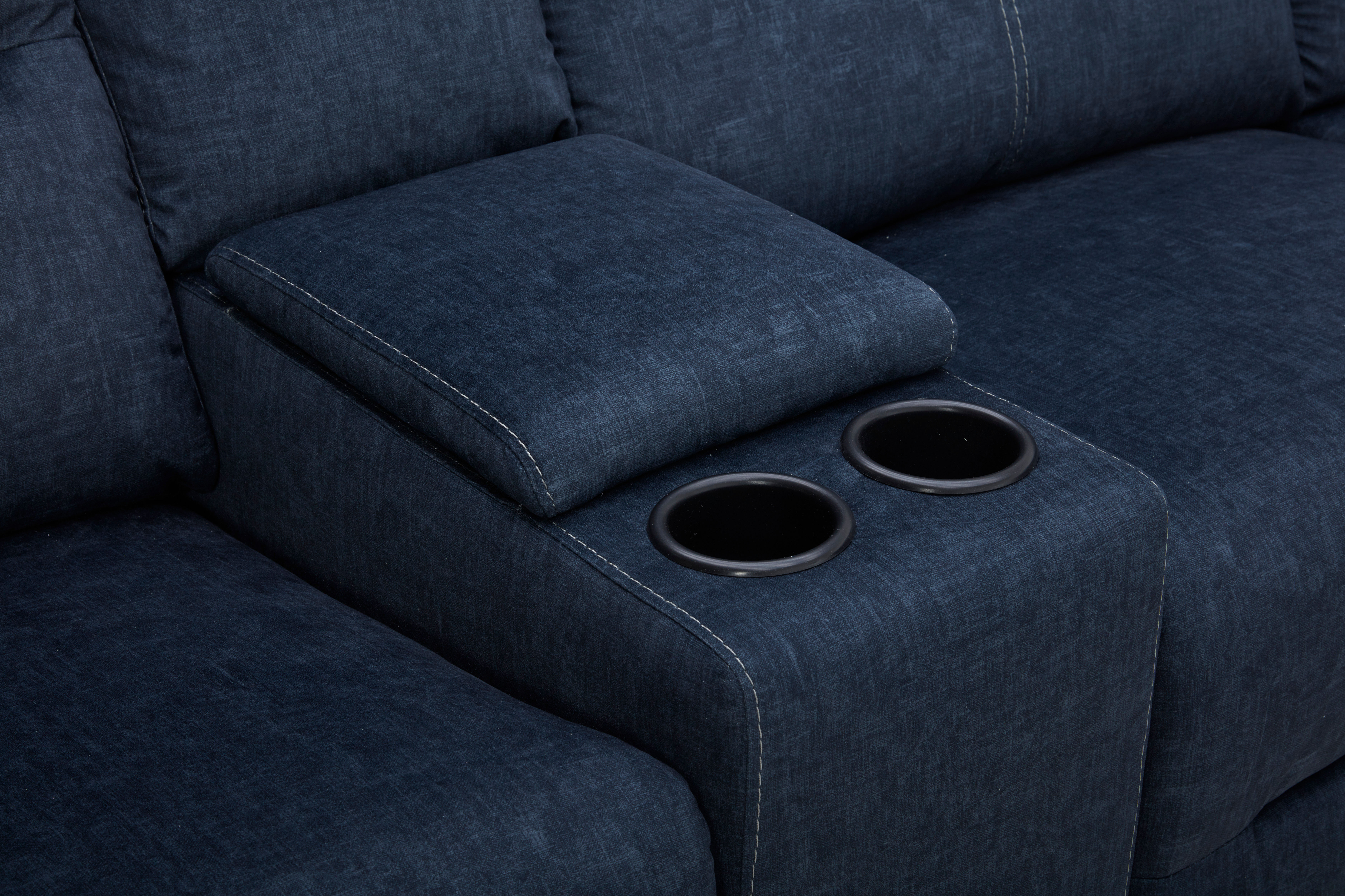 Experience contemporary comfort with this dark blue reclining sectional that has a storage console with cupholders.