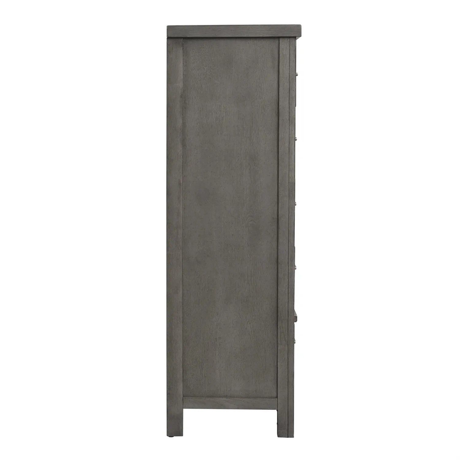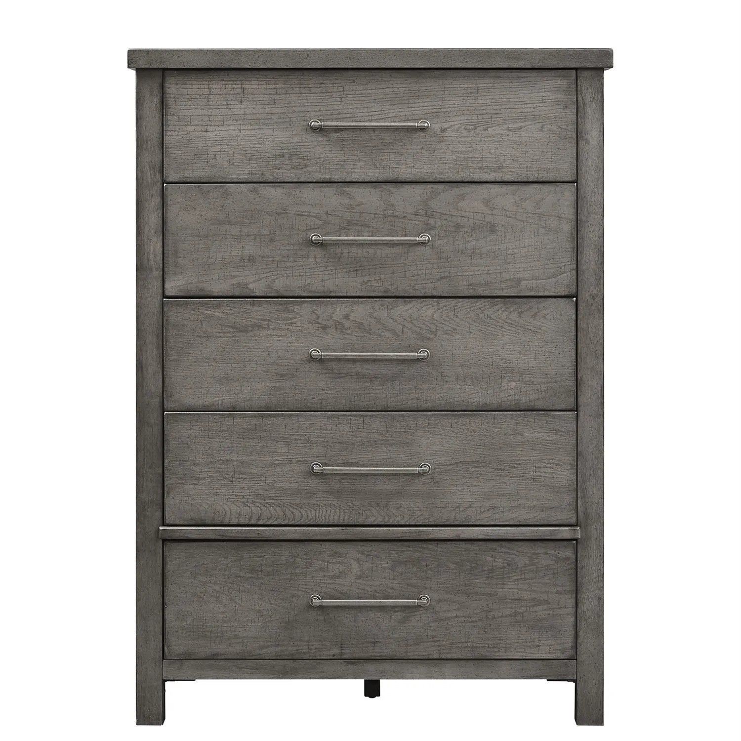 Create an inviting space with the Modern Farmhouse chest. Crafted with poplar solids and knotty white oak veneers, this piece features bottom case dust proofing, cedar lined bottom drawers, fully stained interior drawers and premium felt lined top drawers. The dusty charcoal finish with heavy distressing accompanied by washed brass elongated bar pull hardware offers a neutral palette finish and adds texture to any space.