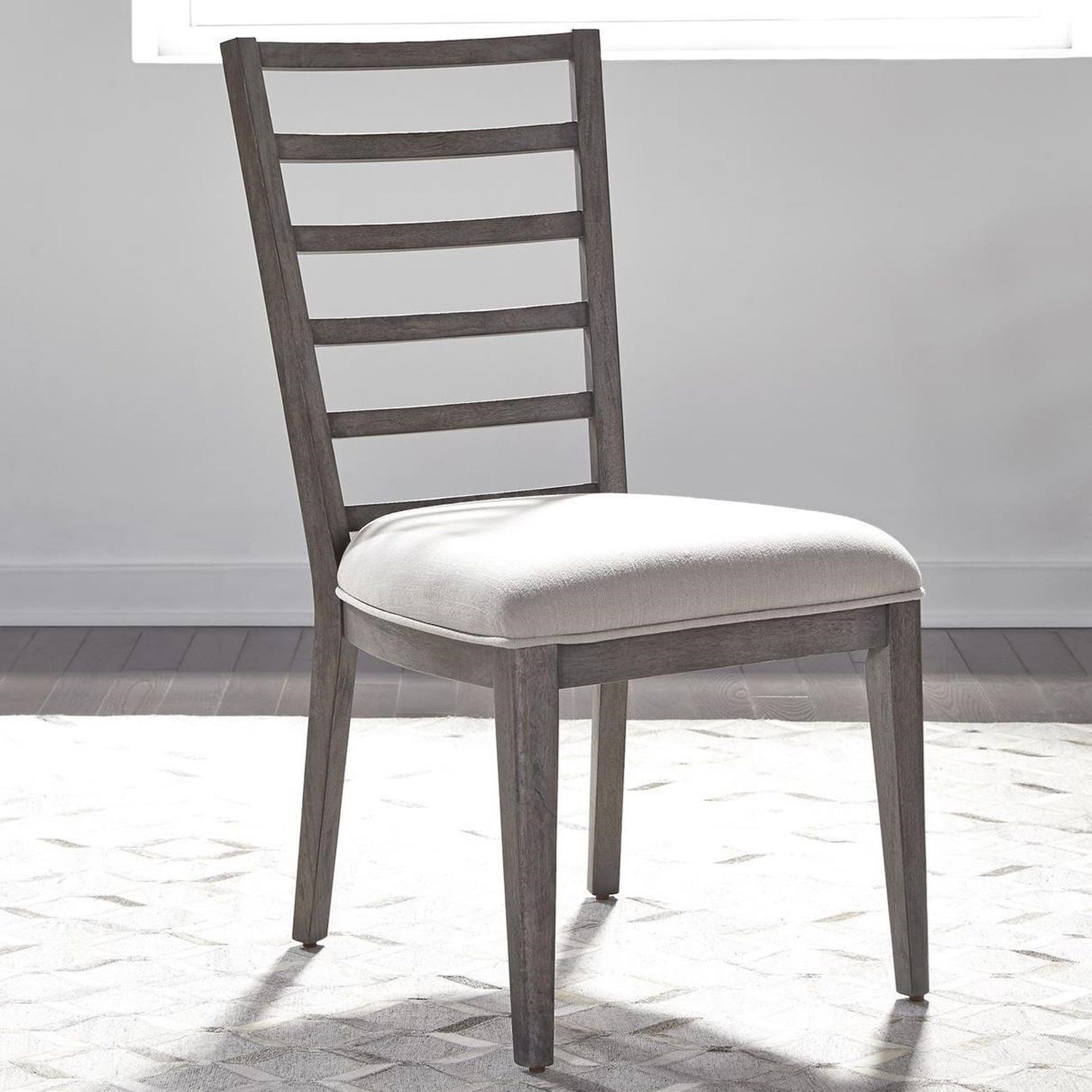 Sit in comfort and style with the Modern Farmhouse ladder back side chair. Crafted of poplar solids, this piece features a dusty charcoal finish with heavy distressing, shaped back slats for comfort, Dakota linen fabric upholstery on the seat, and nylon chair glides to protect your flooring. This chair is available in an alternate finish, sure to compliments any space. The Modern Farmhouse collection features simple clean lines that will create a timeless style, giving you the ability to mix new and older pieces together with a layering effect.
