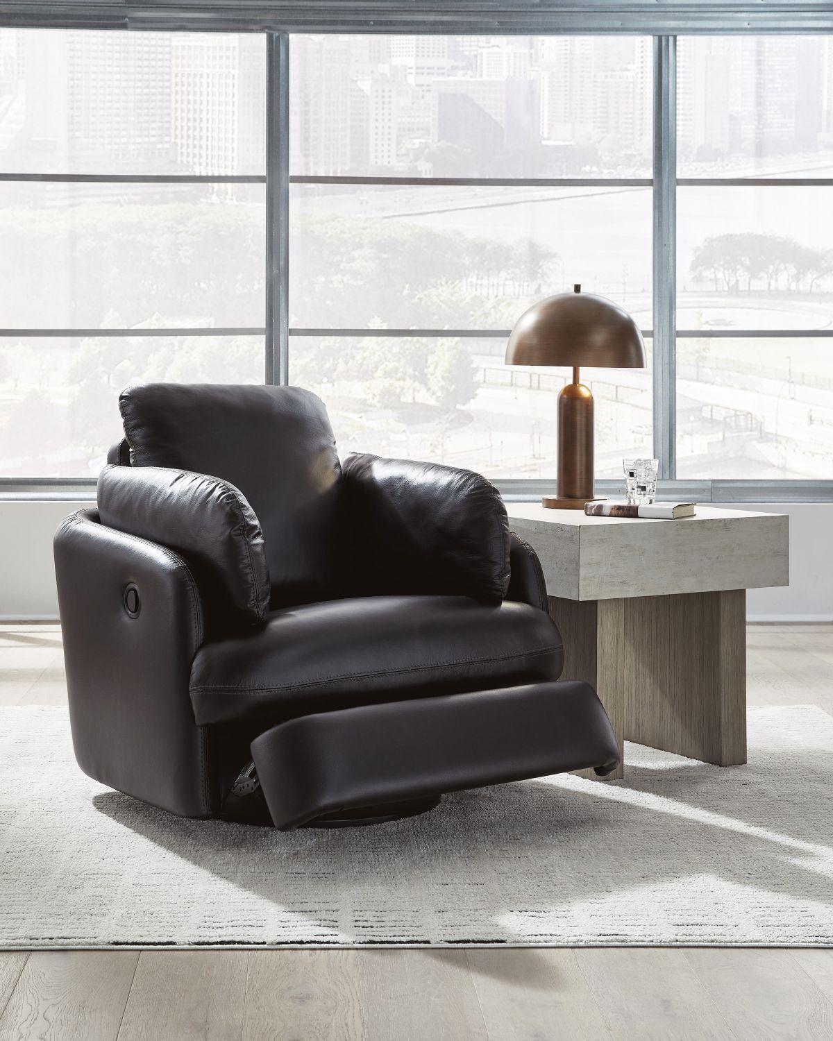 The sleek leather upholstery of the Modmax II swivel glider recliner is an affordable luxury.