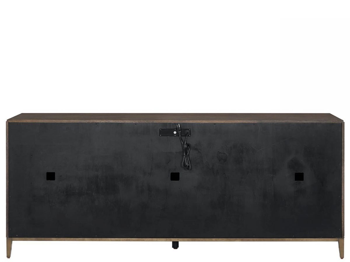 The Montclair Credenza achieves media storage sophistication with striking geometric door fronts in Embossed Cocoa finish. This substantial piece features six adjustable shelves with wire management, a central power bar, and an elegant Smoked Gold metal base for seamless technology integration.