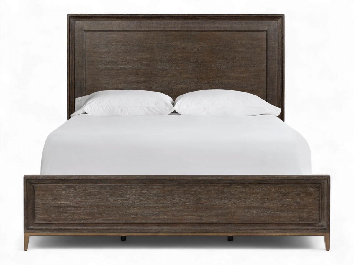 The Montclair Panel Bed offers a contemporary interpretation of traditional panel construction with an innovative inset band in Embossed Cocoa finish. Rich Cocoa framing provides elegant contrast while the metal footboard support with tapered legs adds sophisticated modern appeal.
