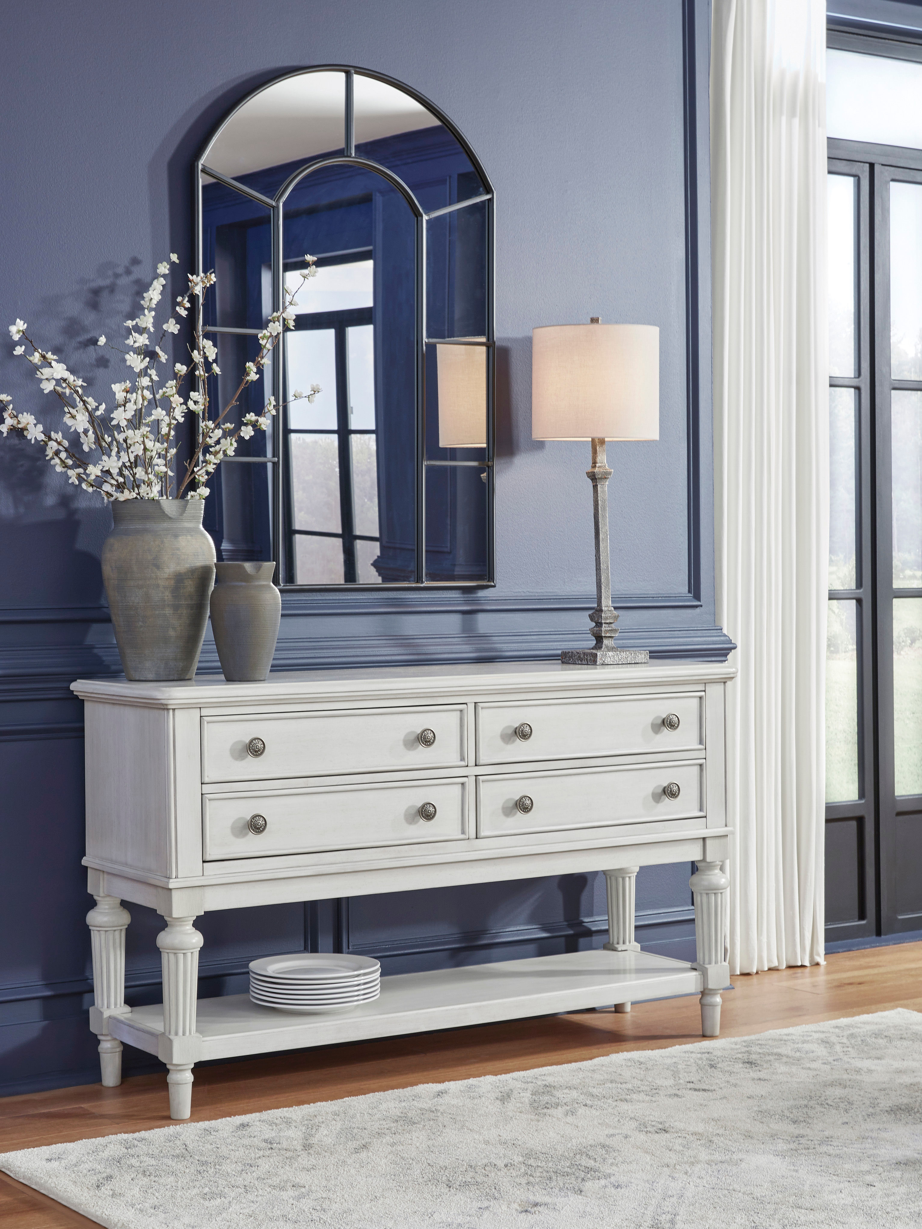 Transform your home into a haven of timeless elegance with this dining server. It pairs a classic antiqued white finish with reeded legs for traditional styling. Four drawers with fully finished interiors offer spacious storage for essentials. The large shelf is perfect for displaying mementos, magazines and more. Whether it's used as a sideboard, entryway table or TV stand, this piece serves your sense of relaxed refinement beautifully.