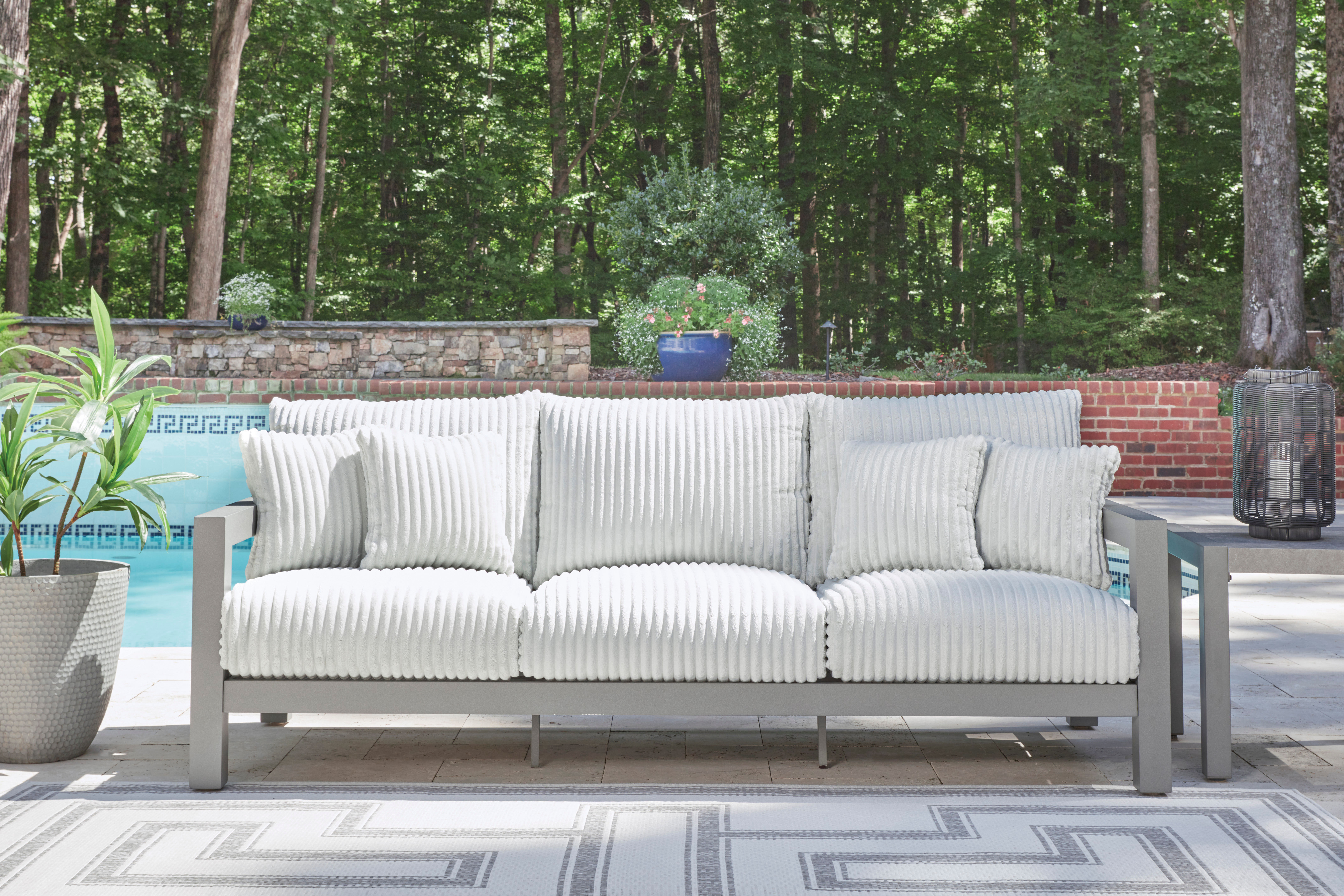 Indulge in luxe outside living without sacrificing longevity. This outdoor sofa combines on-trend texture with a sleek aluminum frame. Lounge poolside or on the porch—the comfy cushions are a chic spot for you and a partner or two to soak up the sun. And with cleanable, UV-resistant Nuvella® fabric in a showstopping corded look, style and durability go hand in hand.