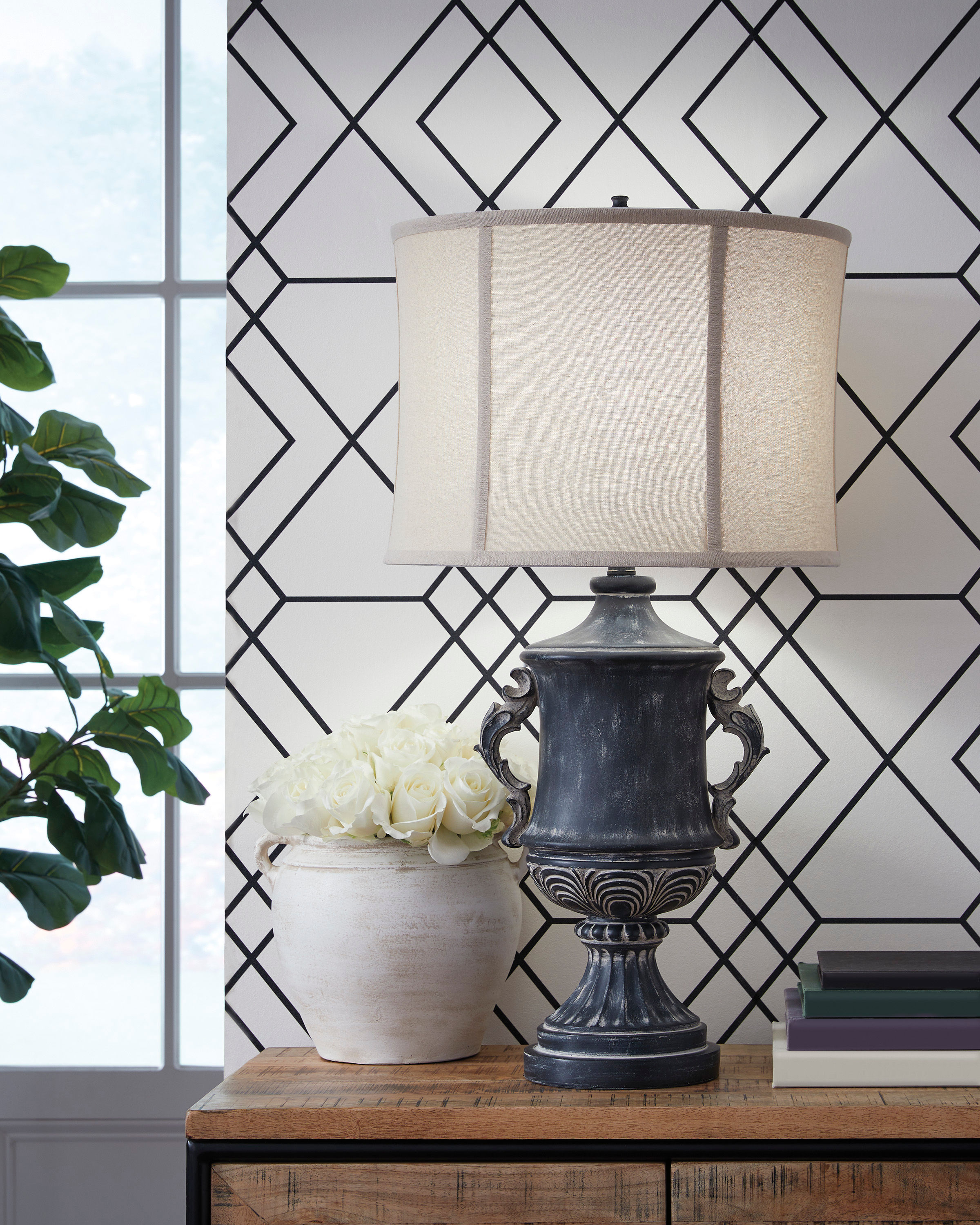 Those who delight in the beauty of a bygone era are sure to be charmed by this richly traditional table lamp. Its base is detailed with ornate patterns and embellished with gracefully curved handles. An antiqued black finish lends a look that’s aged to perfection.
