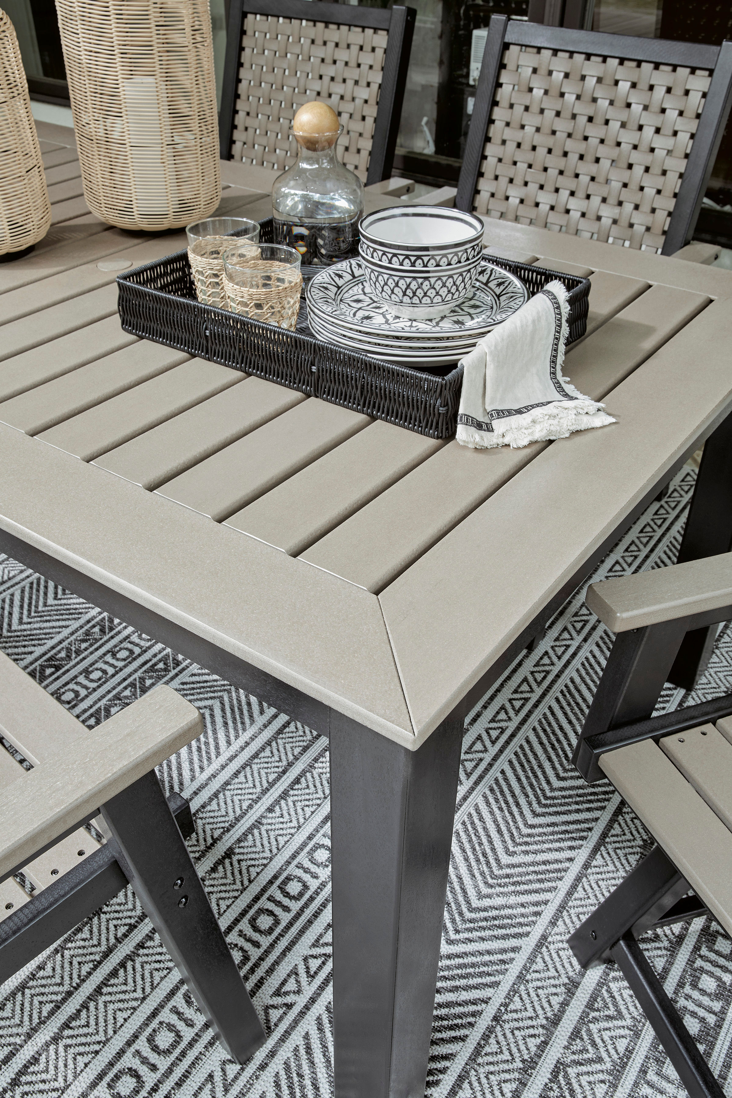 Embrace outdoor dining with the Mount Valley set with an on-trend driftwood and black finish.