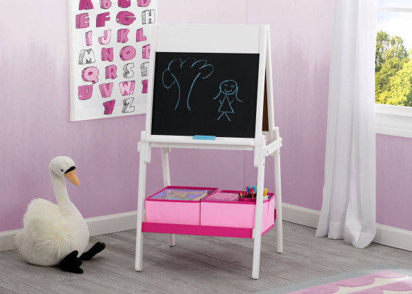 Spark artistic play with the Delta Children MySize Double-Sided Storage Easel. This two-sided easel for kids features three different drawing surfaces-a chalkboard on one side, a magnetic dry-erase whiteboard on the other, and a pull down paper roll on top (33 feet of paper included). Just the right height for growing artists, this kids easel encourages creativity and allows little ones to develop their fine motor skills through painting, drawing, coloring and writing. Two storage bins underneath the easel keep art supplies neat and nearby. Available in a number of popular colors. Coordinates with other items in the Delta Children MySize Collection. MYSIZE Trademark Used With Permission.