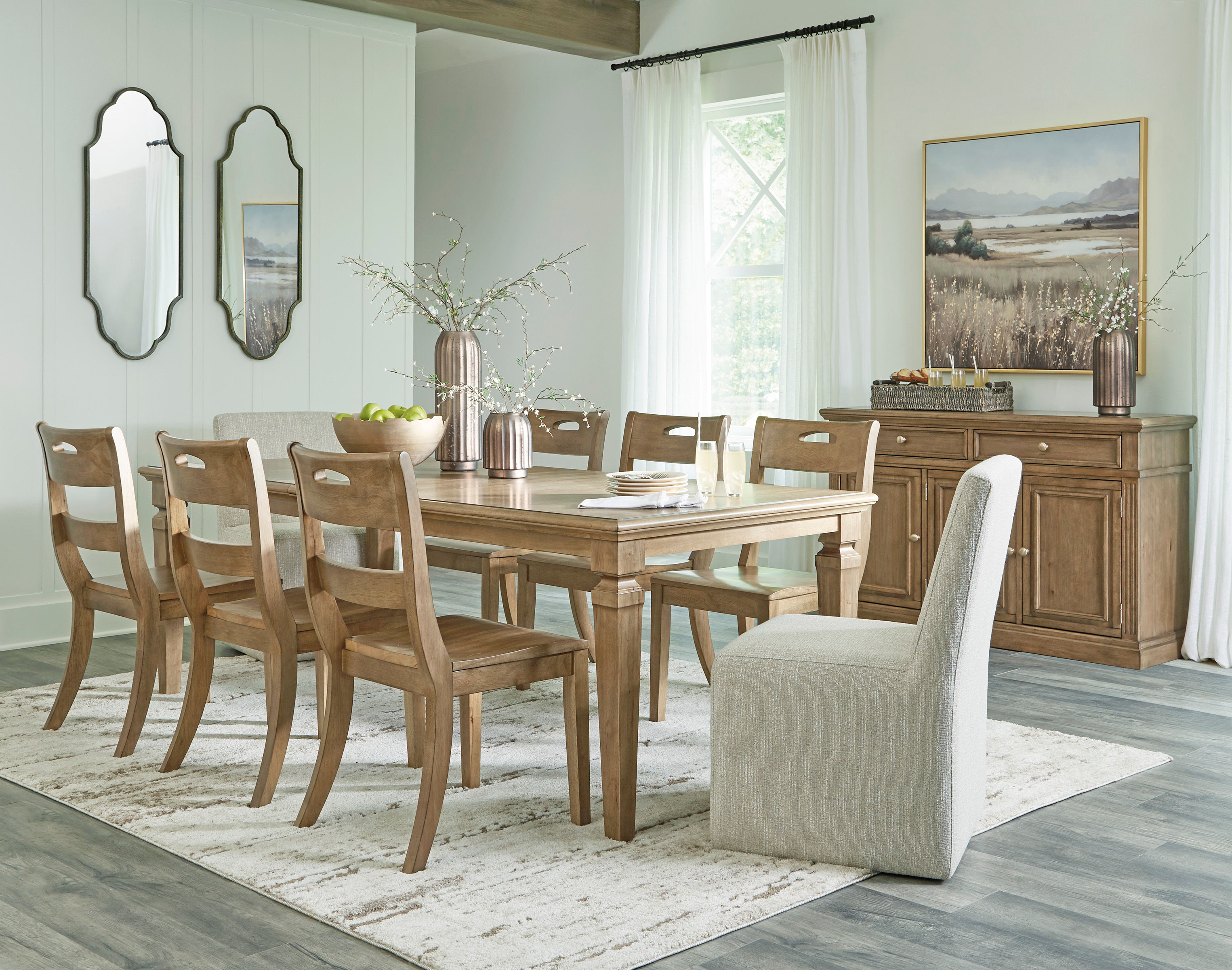 Take a traditional approach to dining room aesthetics. This dining package ushers upscale comfort into your space with its meticulously detailed design. A light brown finish brings warmth to the sculptural silhouettes. Grand in both beauty and function, this transitional set is a masterclass in refinement.