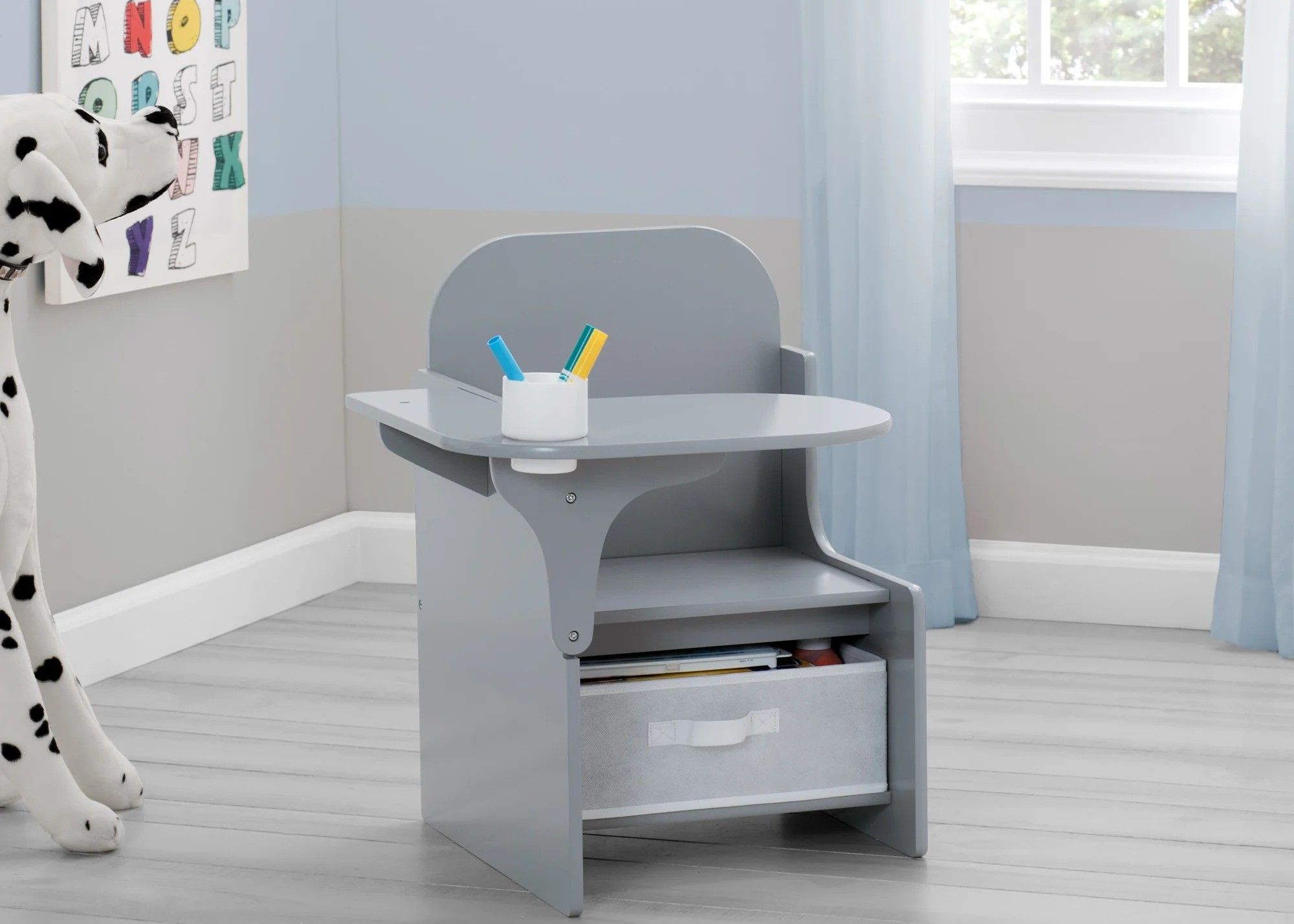 The Delta Children MySize Chair Desk With Storage Bin is a smart and sturdy seating option for your young scholar. Perfectly sized, this durably constructed chair and desk combo works for them and their space with its large work surface and low height that makes it easy for preschool kids and toddlers to get in and out on their own. A removable cup holder for art supplies and storage area underneath with a coordinating fabric bin keeps everything your child needs within reach. The Delta Children MySize Chair Desk With Storage Bin is ideal for drawing, painting, writing or eating, and will look great in any room of your house. Available in several beautiful colors. This Chair Desk with Storage Bin coordinates with other items in the Delta Children MySize Collection. MYSIZE Trademark Used With Permission.