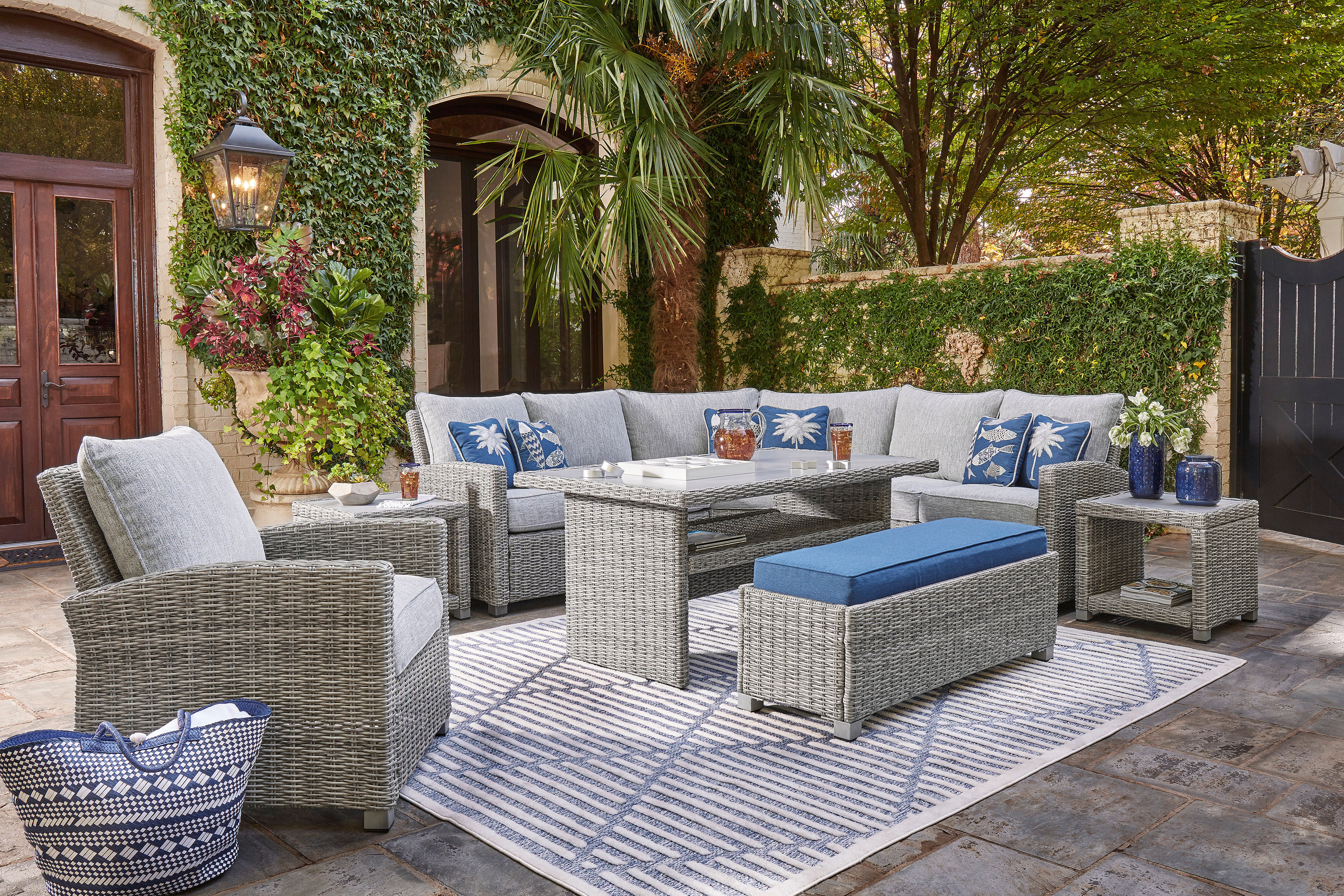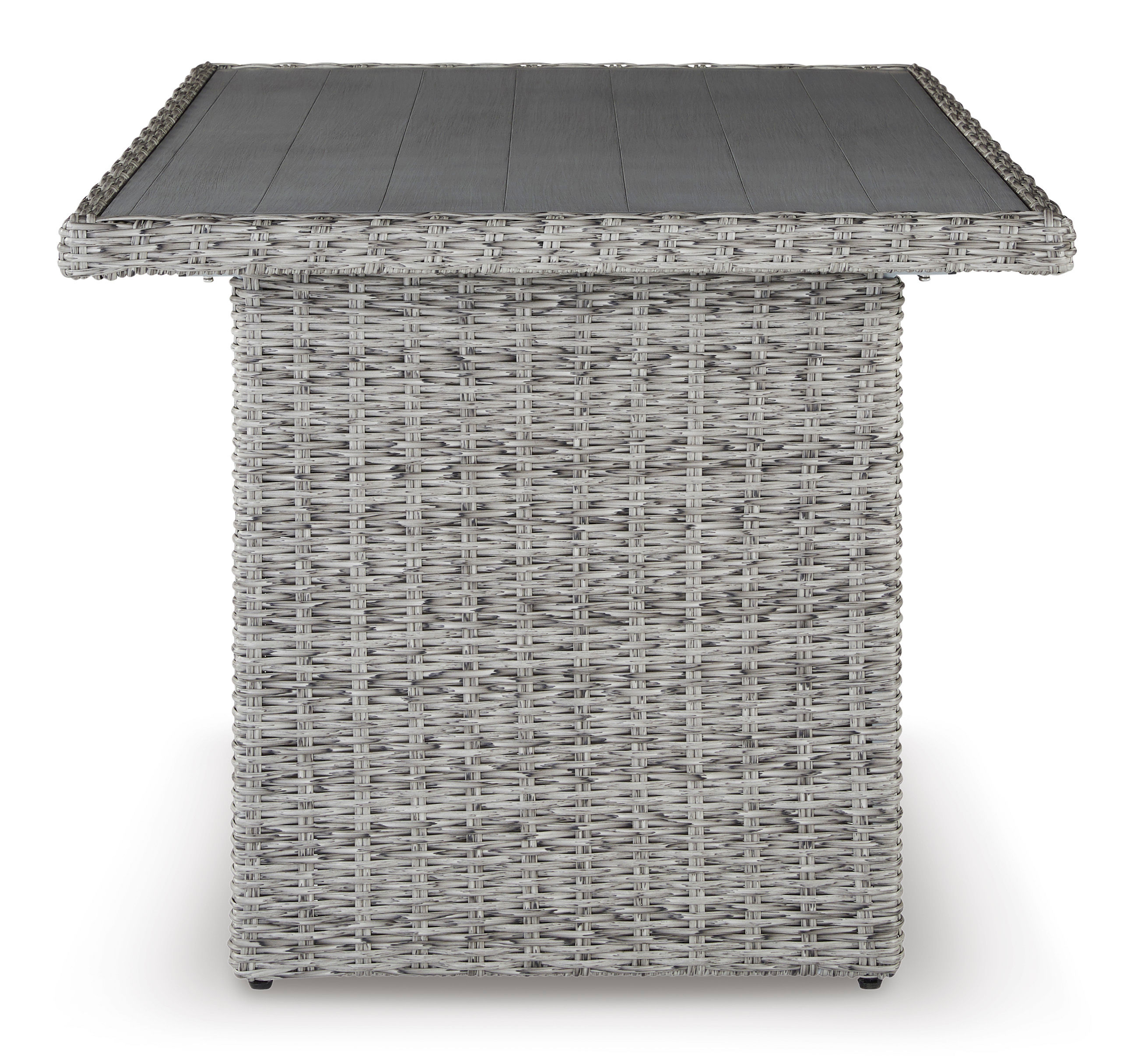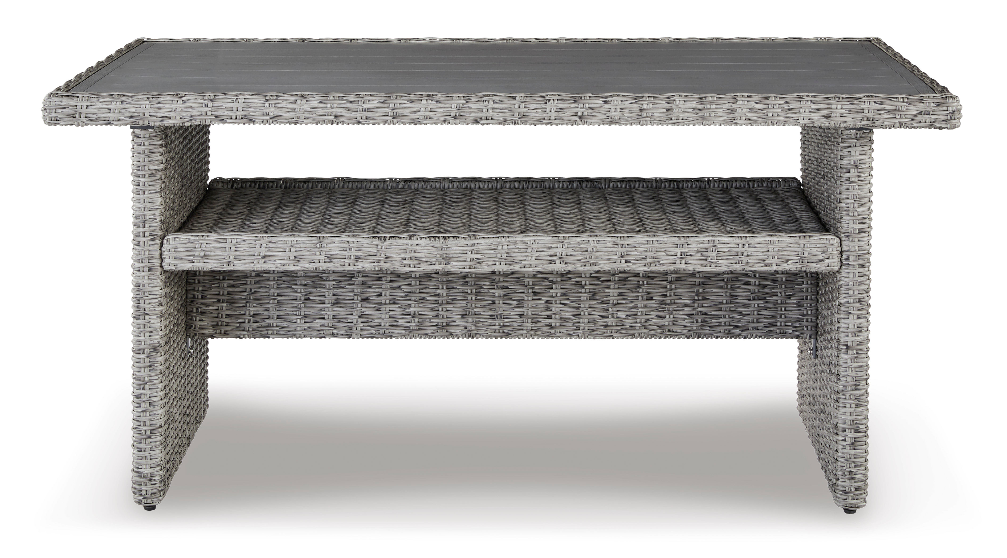 Indulge in backyard bliss. The Naples Beach outdoor multi-use table has a straightforward sense of style with its light gray resin wicker. The table's rust-proof aluminum is enhanced with a wood-look finish, weathering the elements and keeping your aesthetic casually cool.