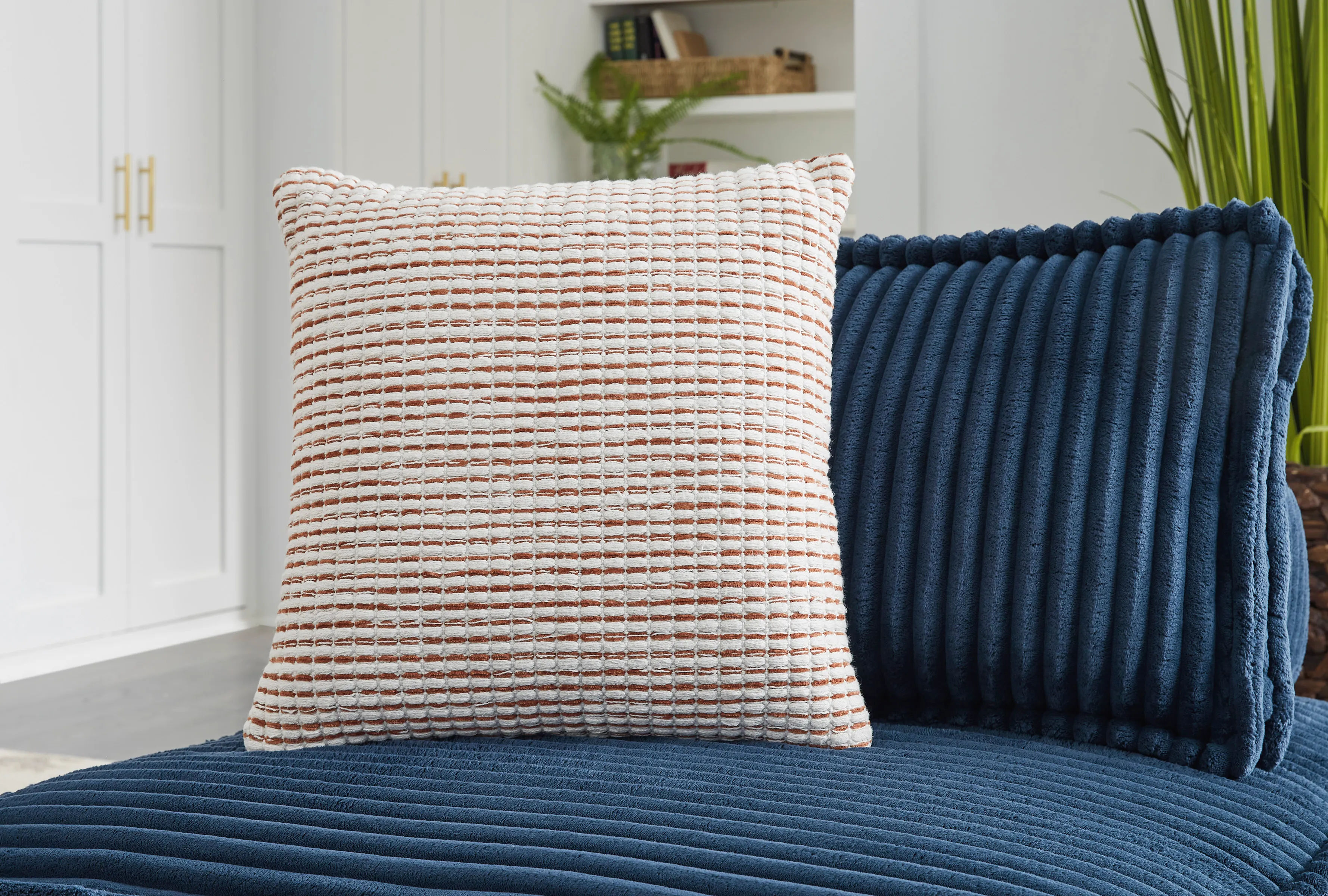 The Nashlin throw pillow’s woven stripe design lends a cozy, laid-back look. Its rust and white hues mingle well with neutrals and earth tones, adding an inviting air to your decor. Toss it on a bed or your go-to chair for a relaxed feel.