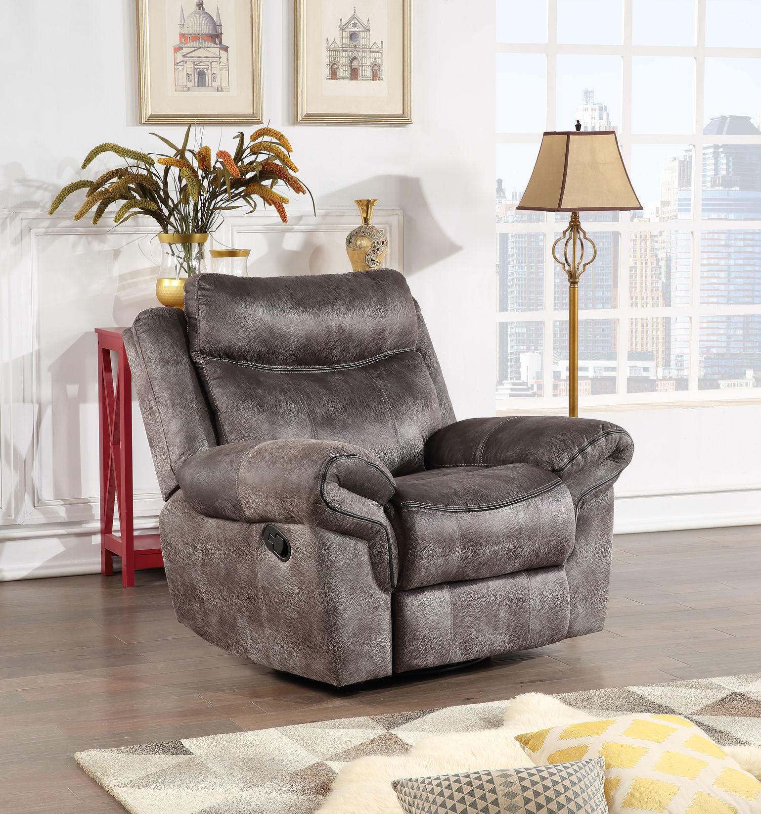 The Nashville Gray Swivel Glider Recliner brings incredible comfort to a room whether reclined or closed. The built-in Glider mechanism adds a comforting gliding motion to the chair while the outside manual lever puts you in a full recline at the flip of a switch. The faux-suede cover is soft to the touch and complements any room with its neutral grey colored cover. Generous arms in an overlapping design add ample padding to complement the lavish seat cushioning for a relaxing reclining experience.