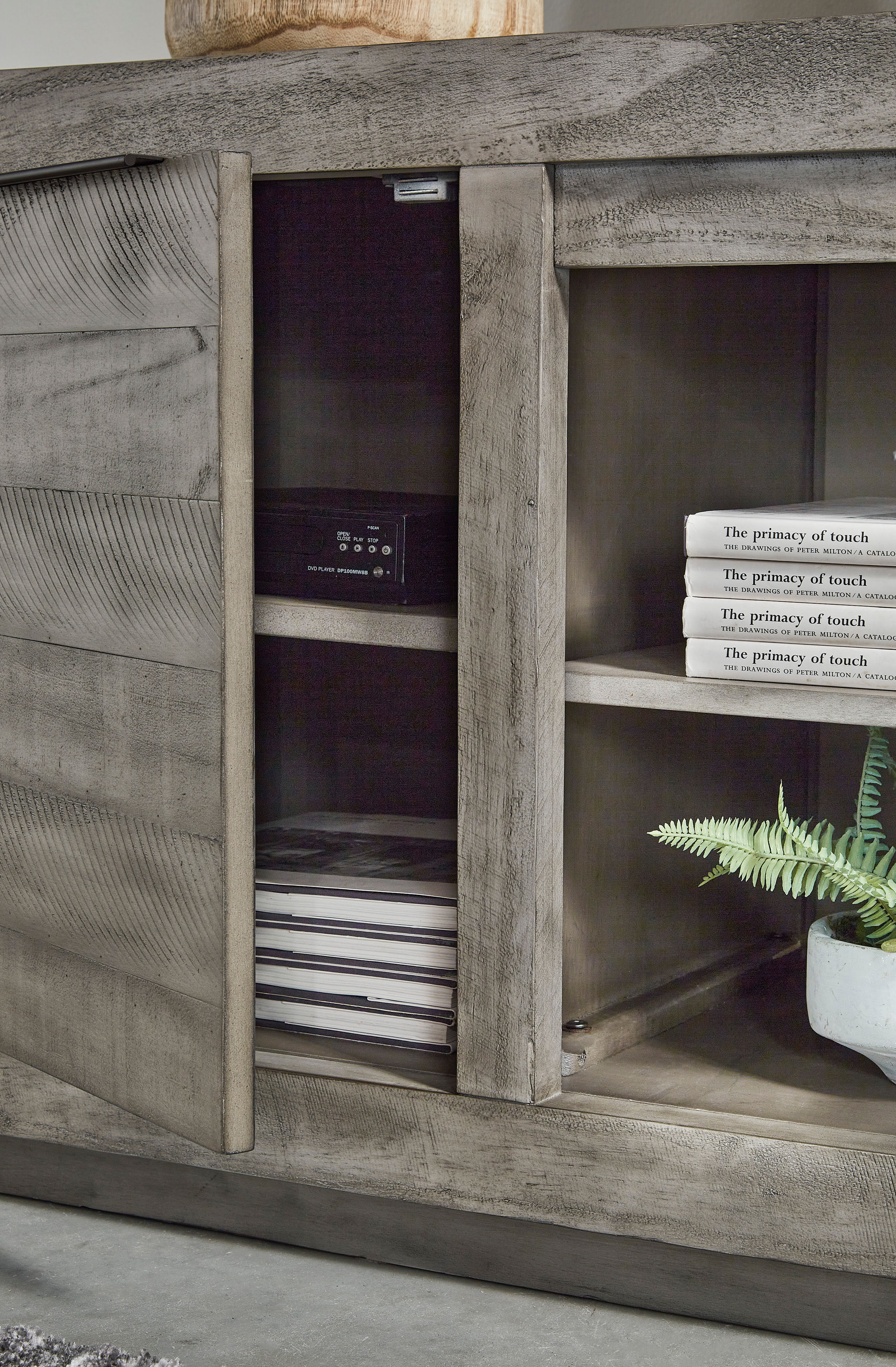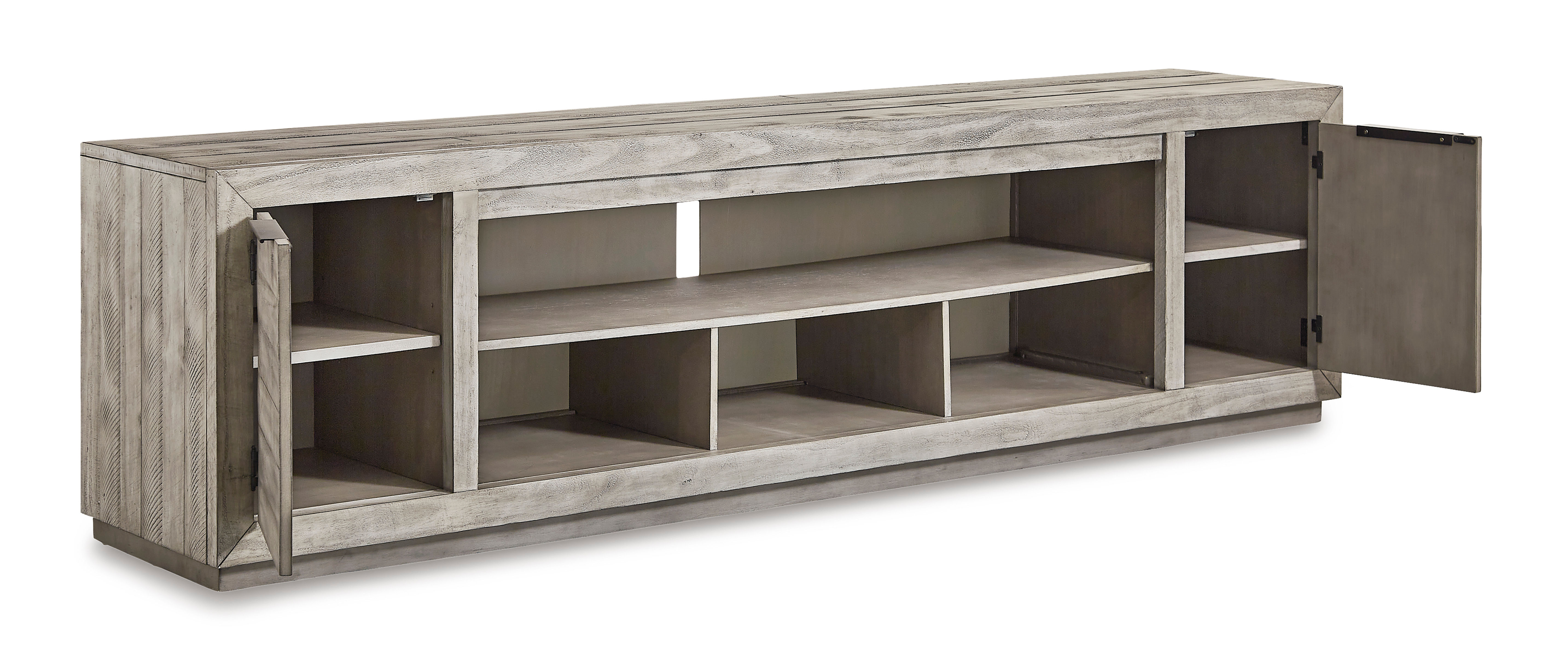 Balancing chic flair with a relaxed sensibility, the Naydell extra-large TV stand strikes just the right tone for rustic sophistication. Beautifully clean lines are subtly enhanced with relaxed distressing and saw marks for authentic barn wood character. You're sure to love the convenient open style for easy access to media equipment and accommodating pretty home accents.